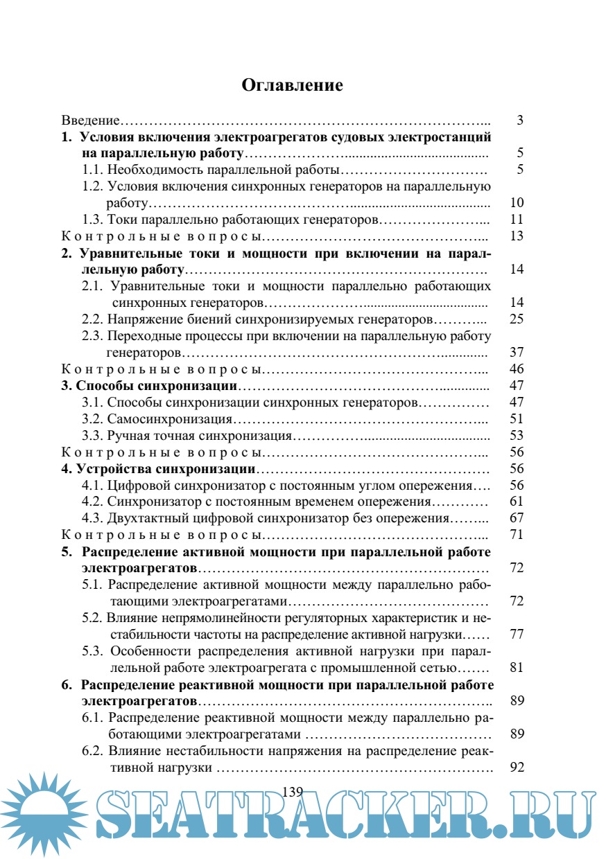 Описание: Рассматриваются вопросы, связанные с синхронизацией синхронных генераторов, распределением нагрузки при параллельной работе, переводом нагрузки с одного источника электроэнергии на другой. Анализируются особенности параллельной работы генераторов судовых электростанций с промышленной сетью.;Гриф:Рекомендовано УМО по образованию в области эксплуатации водного транспорта в качестве учебного пособия для студентов (курсантов) высших учебных заведений, обучающихся по специальности 180407 «Эксплуатация судового электрооборудования и средств автоматики»
