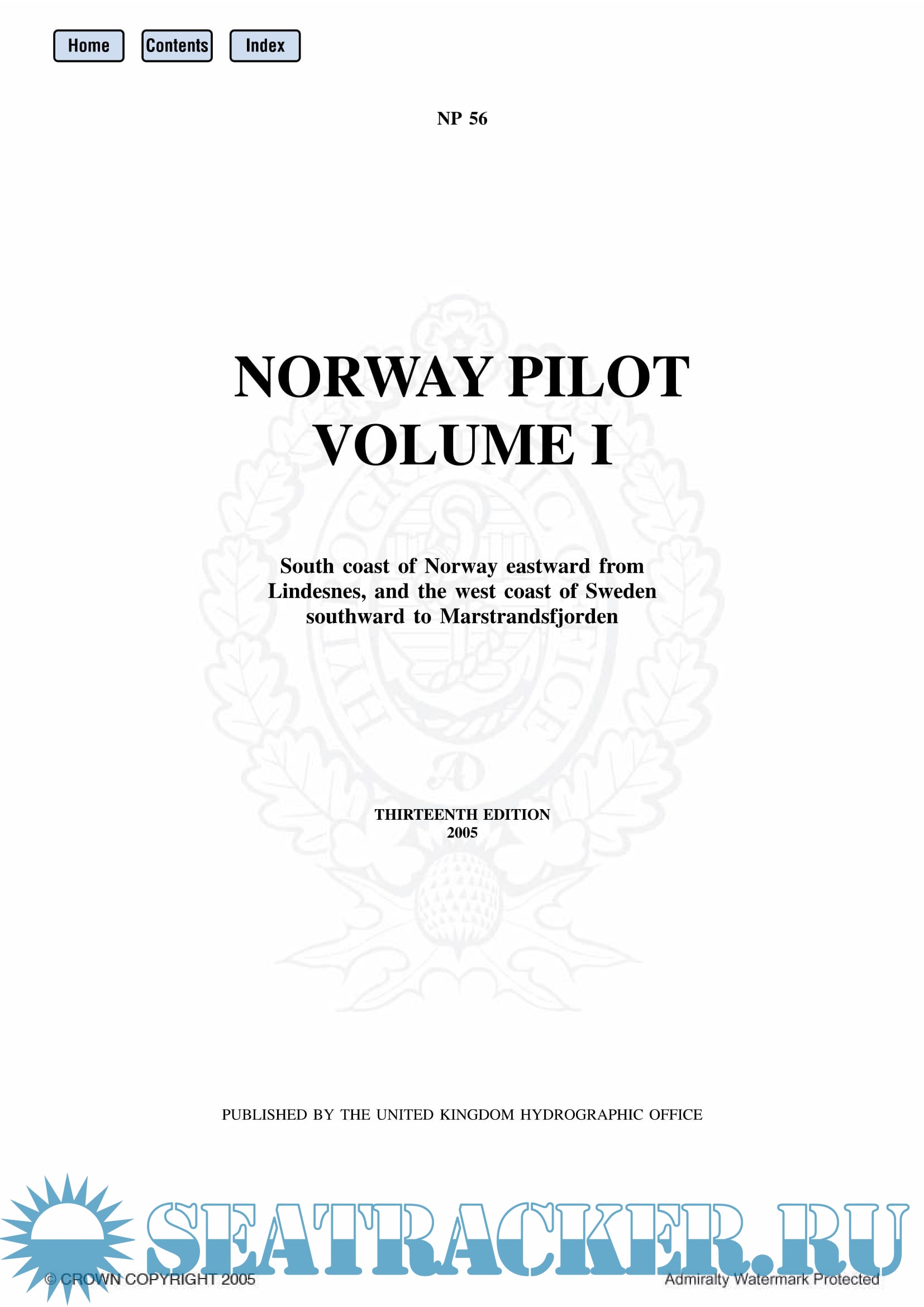 Description: Norway Pilot Vol. I (NP 56) in the British Admiralty Sailing Directions series. It covers the south coast of Norway eastward from Lindesnes, and the west coast of Sweden southward to Marstrandsfjorden.