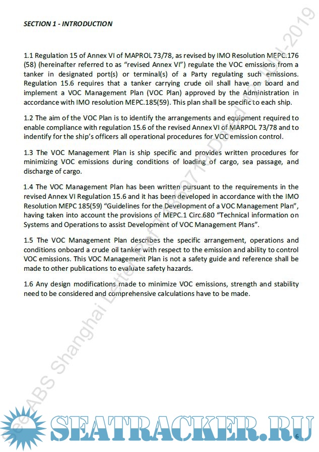 Description: The aim of the VOC Plan is to identify the arrangements and equipment required to enable compliance with regulation 15.6 of the revised Annex VI of MARPOL 73/78 and to indentify for the ship’s officers all operational procedures for VOC emission control.