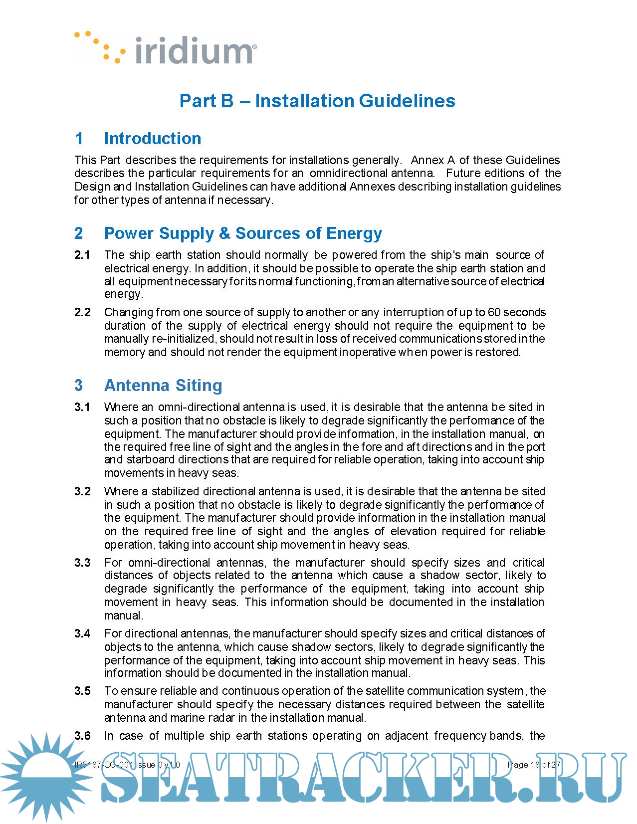 Description: These “Design and Installation Guidelines” provide general information on the design and installation of Iridium ship earth stations operating within the Global Maritime Distress and Safety System, GMDSS. These guidelines are arranged in two parts, Part A containing guidelines for design according to the IMO’s performance standards for ship earth stations for use in the GMDSS, and Part B containing general guidelines for installation of ship earth stations.