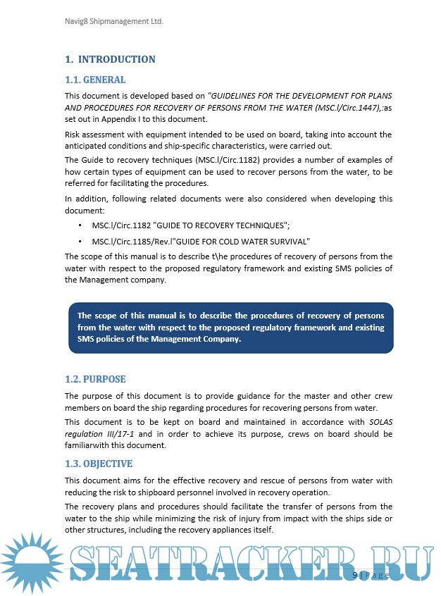 The scope of this manual is to describe t\he procedures of recovery of persons from the water with respect to the proposed regulatory framework and existing SMS policies of the Management company.
