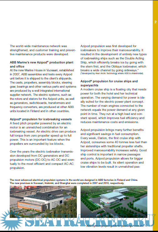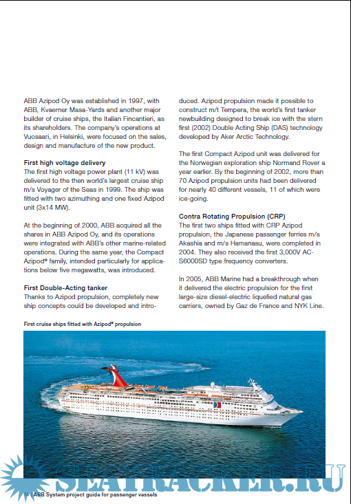 Year: 2011 Language: english Author: ABB Genre: Technical book Format: PDF Quality: eBook Pages count: 268 Description: Through innovative solutions, high competence and global capability, ABB Marine contributes to reliable, safe, more profitable and environmentally friendly operation of high-performance vessels. Our roots go back to the early days of electrifying the society. ABB Marine has supplied electric power and propulsion systems to ships for nearly a century already, and the number of vessel types and customers preferring electric propulsion is continuously increasing. We have the longest experience and the largest number of installed electric propulsion systems worldwide.