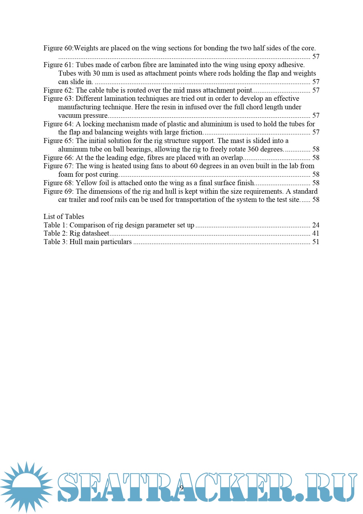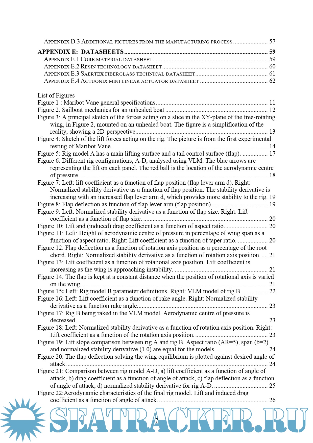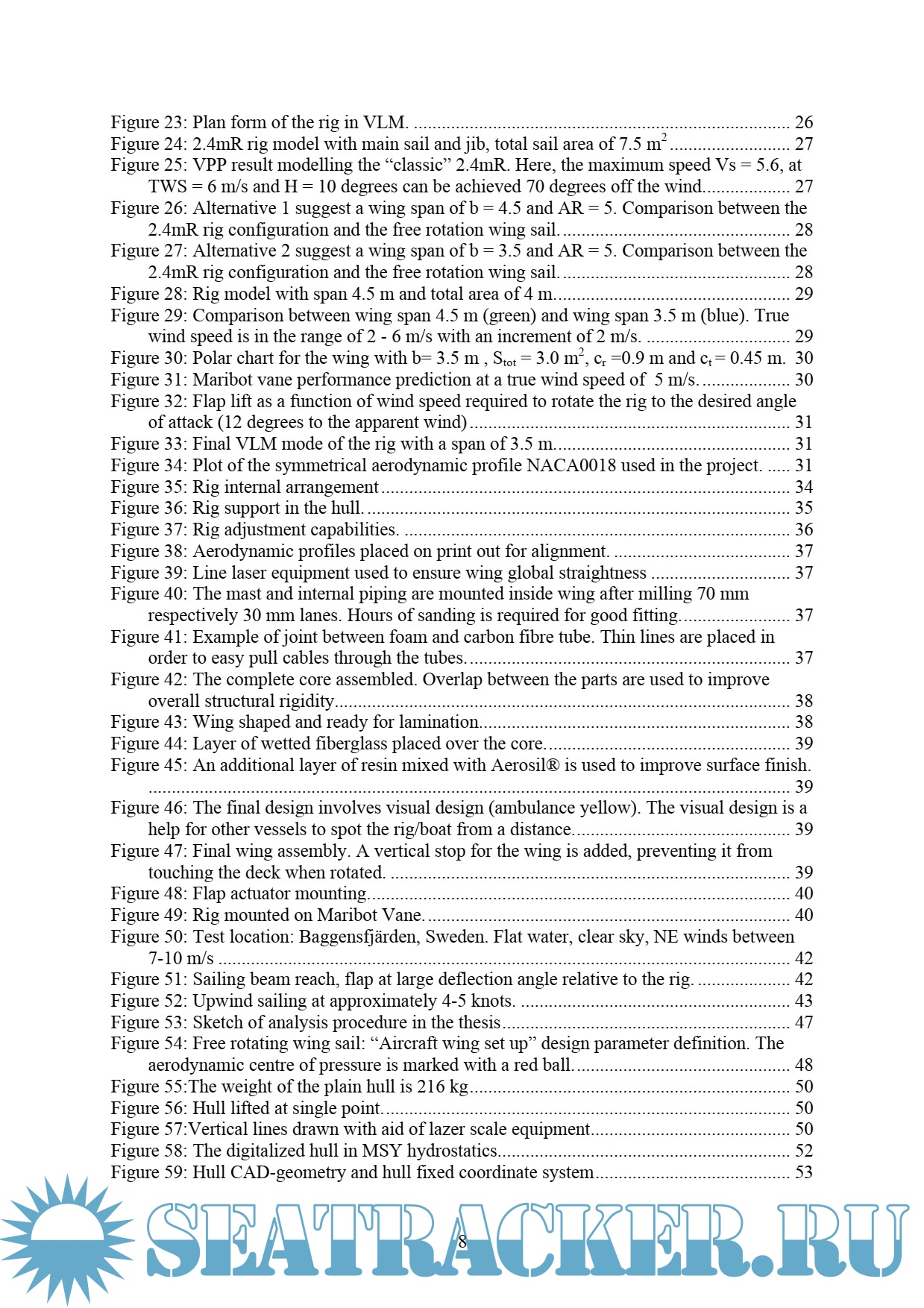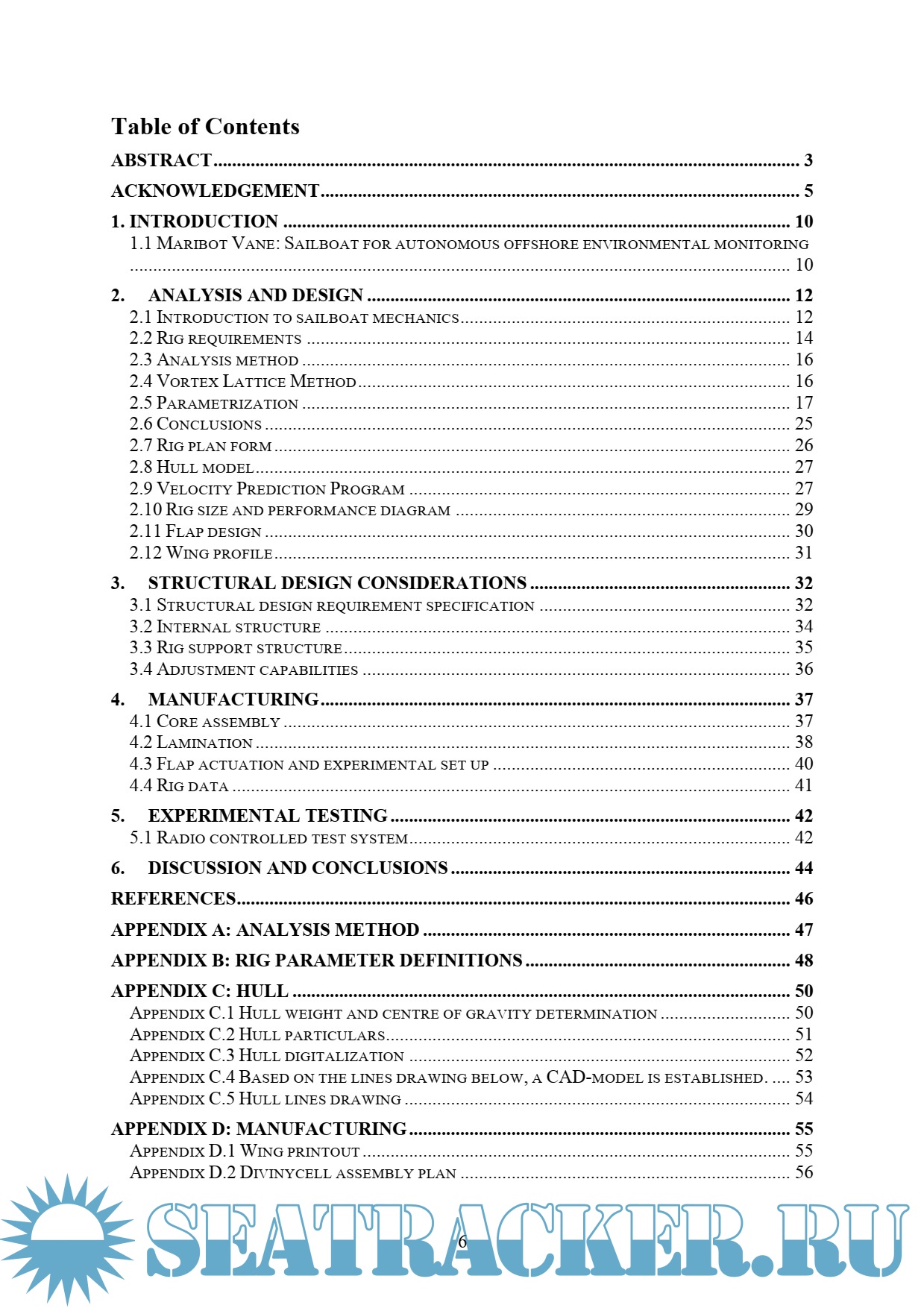 Year: 2017 Language: english Author: Tretow C. Genre: Technical book Publisher: School of Engineering Sciences Format: PDF Quality: Scanned pages Pages count: 64 Description: There is an accelerating need for ocean sensing where autonomous vehicles can play a key role in assisting engineers, researcher and scientists with environmental monitoring and colleting oceanographic data. This thesis is performed in collaboration with a research group at The Royal Institute of Technology that currently develops an autonomous sailboat to be used as a sensor carrying platform for autonomous data acquisition in the Baltic Sea. This type of vehicle has potentials to be a helpful and cheaper alternative to a commercial research vessel. The thesis presents the design, construction and experimental testing of a rigid free-rotating wing sail for this autonomous sailboat. The goal is to design a rig that can sustain under all occurring weather conditions in the Baltic sea while ensuring sailing performance, robustness, reliability and low power consumption, which are key aspects driving the design. The rig is designed through the utilization of analysis and design methods involving a Vortex Lattice Method combined with a Velocity Prediction Program in order to achieve best possible aerodynamic performance with respect to the application requirements. The rig is manufactured as a sandwich structure with a light core material, reinforced with fiberglass and laminated using advanced resin technology. The main challenges in the development process are structural arrangement, rigidity and weight as well as integration of subsystems and achieving overall robustness. Initial experimental testing, sailing under radio control, has been performed showing promising results. The vehicle was operated under moderate weather conditions, 8 – 10 m/s NE winds, at Baggensfjärden, Sweden, where expected behaviour, wing structure rigidity, boat speed and manoeuvrability was successfully demonstrated. Future challenges are now to further develop navigational control and guidance strategy, pushing the technology front forward in autonomous sailing.