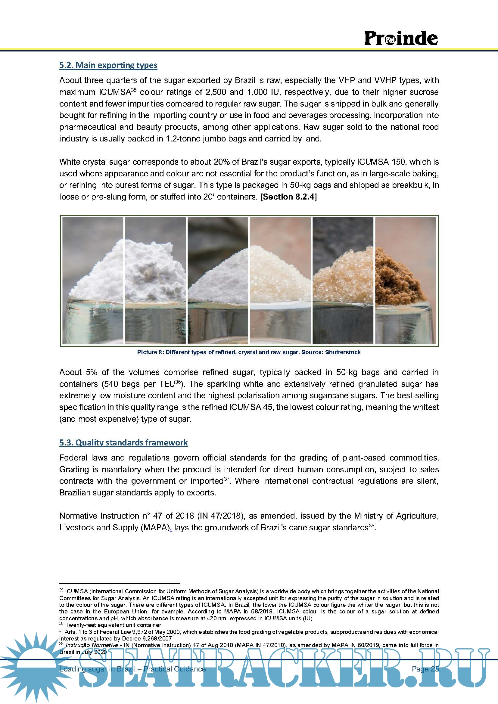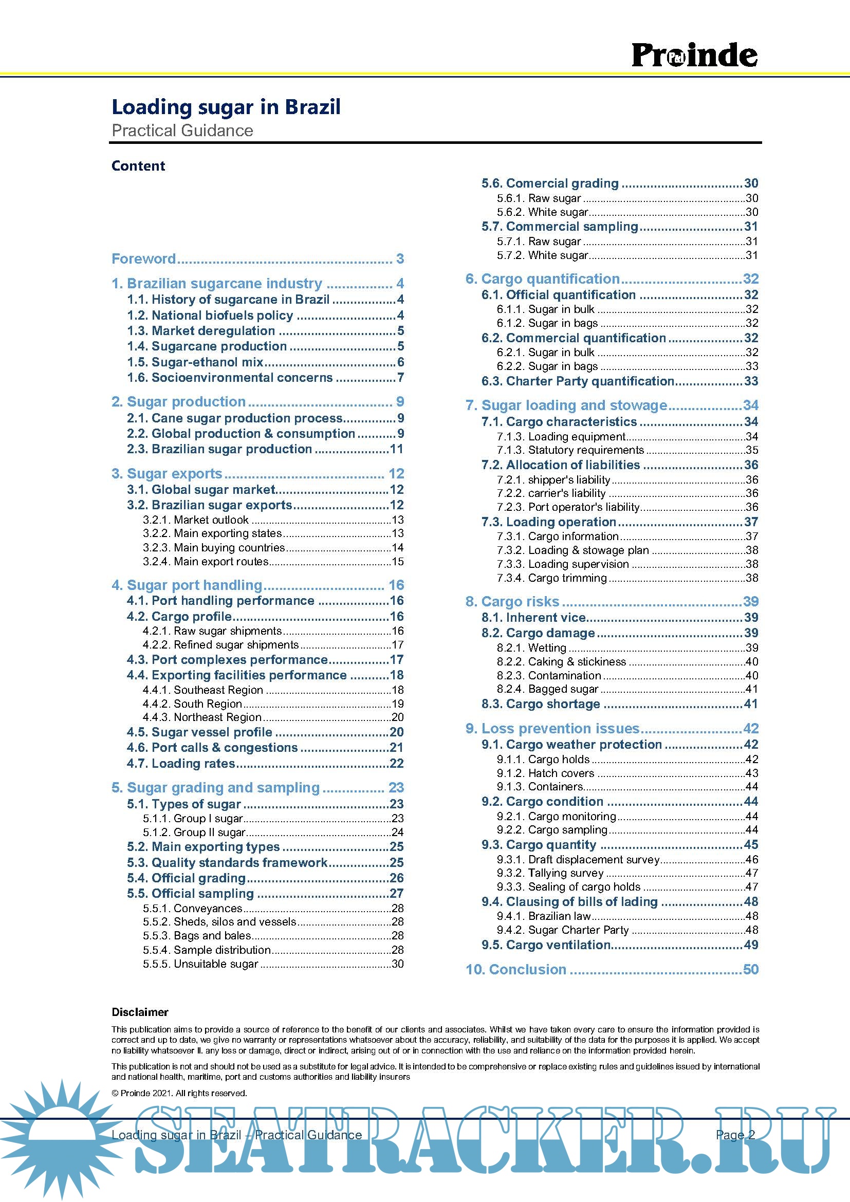 Year: 2021 Language: english Author: Proinde Genre: Guide Format: PDF Quality: eBook Pages count: 51 Description: To help clients and associates doing business in the country better understand why the traditional commodity stands out as one of the vital agriproducts that help boost the Brazilian economy – and keep ports busy –, we have condensed this guide with comprehensive information about the national sugar industry, the local practices and regulations, this guide will be a valuable source of reference and practical information. Firstly, briefly walk through the history of sugarcane in Brazil, its production, export, and port handling volumes, along with statistical information, then summarise the applicable national and international grading standards and legal framework for quantifying, loading, and carrying sugar cargoes and allocating liabilities among the various stakeholders. Following the guidelines of international authorities and leading P&I clubs, have put together some practical advice on the main risks of loading sugar in Brazil and best practices for carrying the sweet commodity preventing, or at least minimising, cargo losses. :