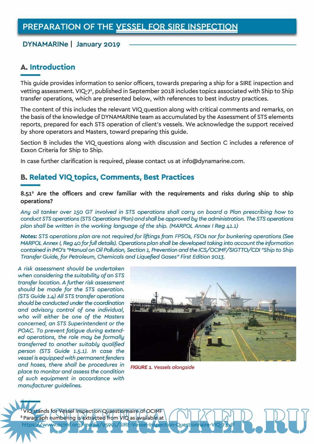 The content of this includes the relevant VIQquestion along with critical comments and remarks, on the basis of the knowledge of DYNAMARINe team as accumulated by the Assessment of STS elements reports, prepared for each STS operation of client's vessels. We acknowledge the support received by shore operators and Masters, toward preparing this guide.