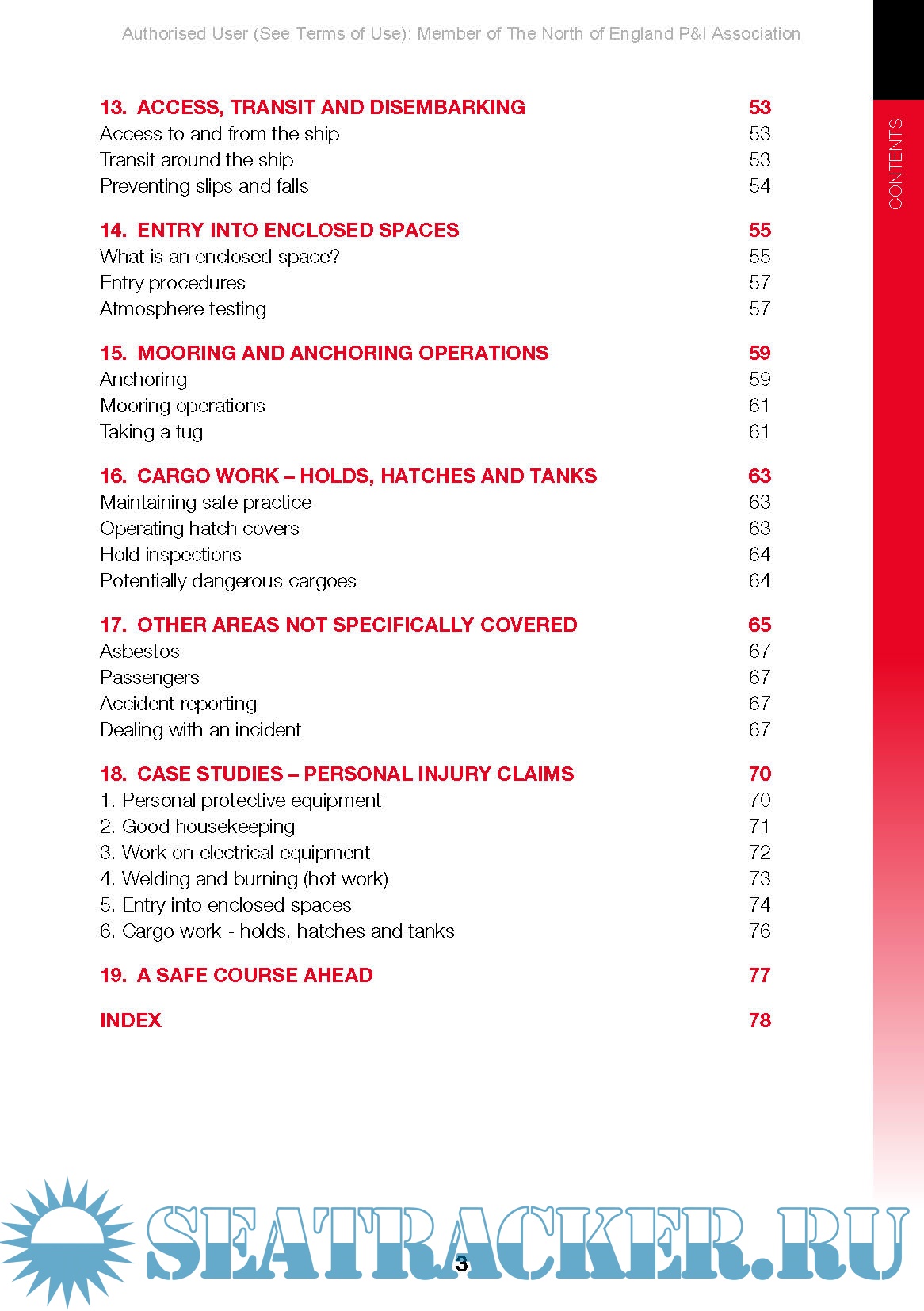 The book identifies the key safety practices that should be implemented on every ship, including shipboard safety management, work planning and use of personal protective equipment (PPE). It discusses a number of onboard operations, including electrical maintenance, handling shipboard chemicals, use of lifting equipment, hot work, enclosed space entry, mooring operations, cargo handling and galley work. It describes the potential hazards and sets out safeguards and best practices.