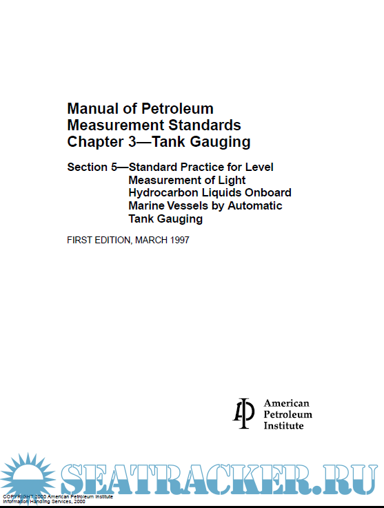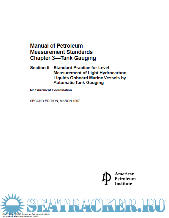 Year: 1997 Language: english Author: API Genre: Guide Format: PDF Quality: eBook Pages count: 18 Description: Manual of Petroleum Measurement Standards Chapter 3—Tank Gauging - Section 5—Standard Practice for Level Measurement of Light Hydrocarbon Liquids Onboard Marine Vessels by Automatic Tank Gauging
