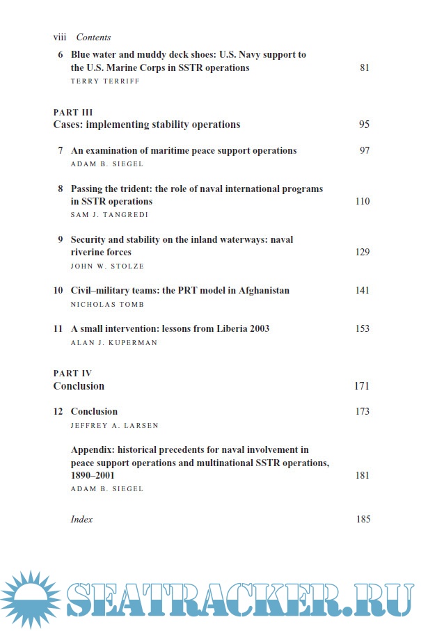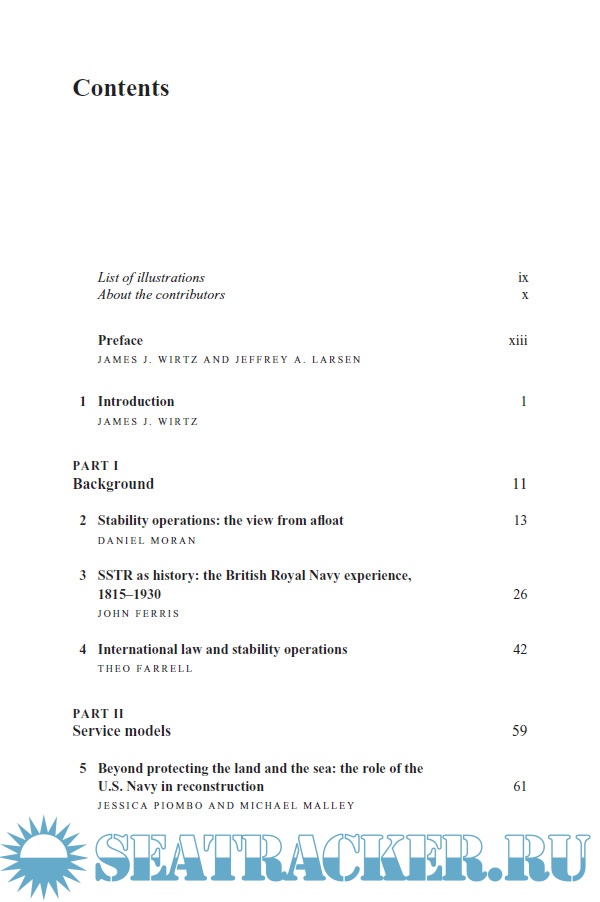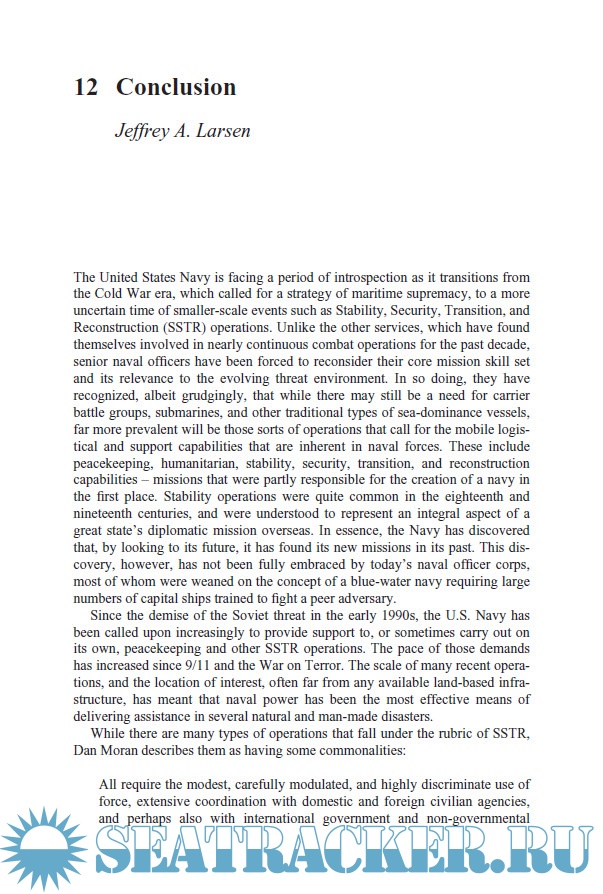 The book argues that SSTR operations are challenging because they create new missions and basing modes, and signal a return to traditional naval methods of operation. Mission accomplishment requires collaboration with a wide range of actors representing governmental, non-governmental and commercial organizations, which often creates politically and bureaucratically charged issues for those involved. However, although from a traditional warfighting perspective, stability operations might be viewed as having little to do with preparing for high-intensity conventional combat, these kinds of operations in fact correspond to traditional missions related to diplomacy, engagement, maritime domain awareness, piracy and smuggling, and intervention to quell civil disturbances. SSTR operations can be therefore depicted as a return to traditional naval operations, albeit operations that might not be universally welcomed in all quarters.