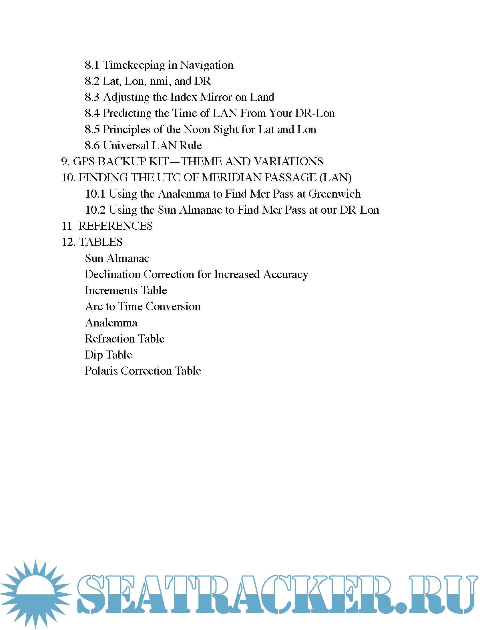 Our guiding principle for this booklet was to provide a means of learning and executing a position fix at sea when a vessel has lost its GPS navigation. We wanted a solution that is compact and inexpensive, using tables and procedures that are easy to learn and use. This goal led to our proposing a minimum kit that mariners would not hesitate to add to their gear to cover the unlikely situation it would actually be needed. Mariners who cross oceans in small boats realize they must be self-reliant and cover all contingencies.
