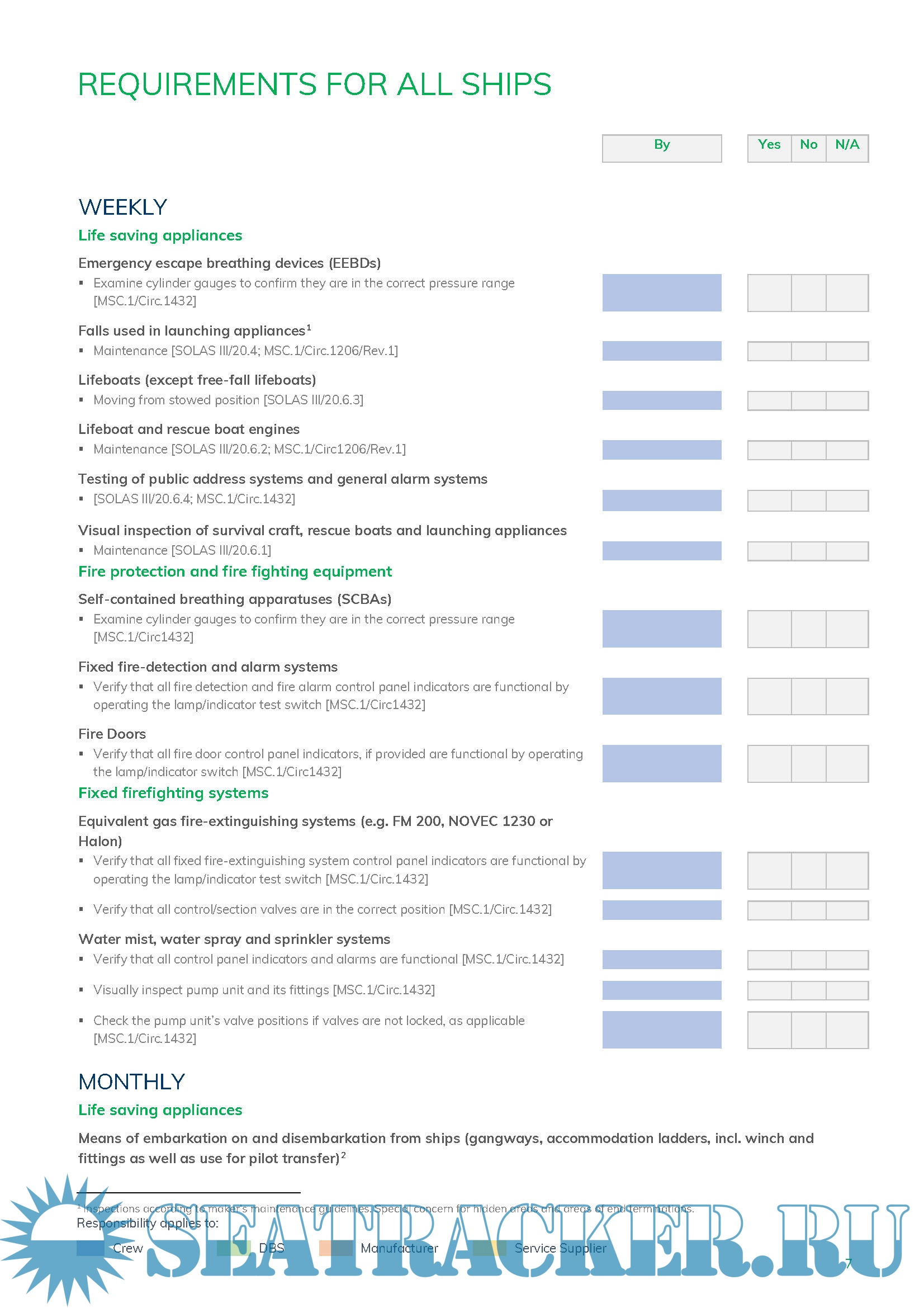 Year: 2020 Language: english Author: DBS Format: PDF Quality: eBook Pages count: 27 Description: DBS is releasing the updated technical publication concerning the requirements for maintenance and inspection of firefighting, lifesaving and radio equipment as well as drills as per statutory instruments. The publication includes requirements for: On-board Maintenance & Inspection of Fire Protection Systems and Life-Saving Appliances Servicing, Inspection & Testing of Accommodation Ladders, gangways, davits and winches Servicing, Inspection & Testing of Launching Appliances (davit and winch) Servicing, Inspection & Testing of Lifeboat on-load release gear Servicing, Inspection & Testing of Davit-launched liferaft automatic release hooks Servicing, Inspection & Testing of Radio and Navigation Equipment On-board Training and Drills The information should be used for the ship’s on board maintenance plan as required by SOLAS regulation II-2/14. In accordance with ISM Code Section 10.1 the safety management system of the company must provide a maintenance plan which ensures maintenance and inspection of the ship and equipment according to the relevant rules and regulations, codes, guidelines and standards.