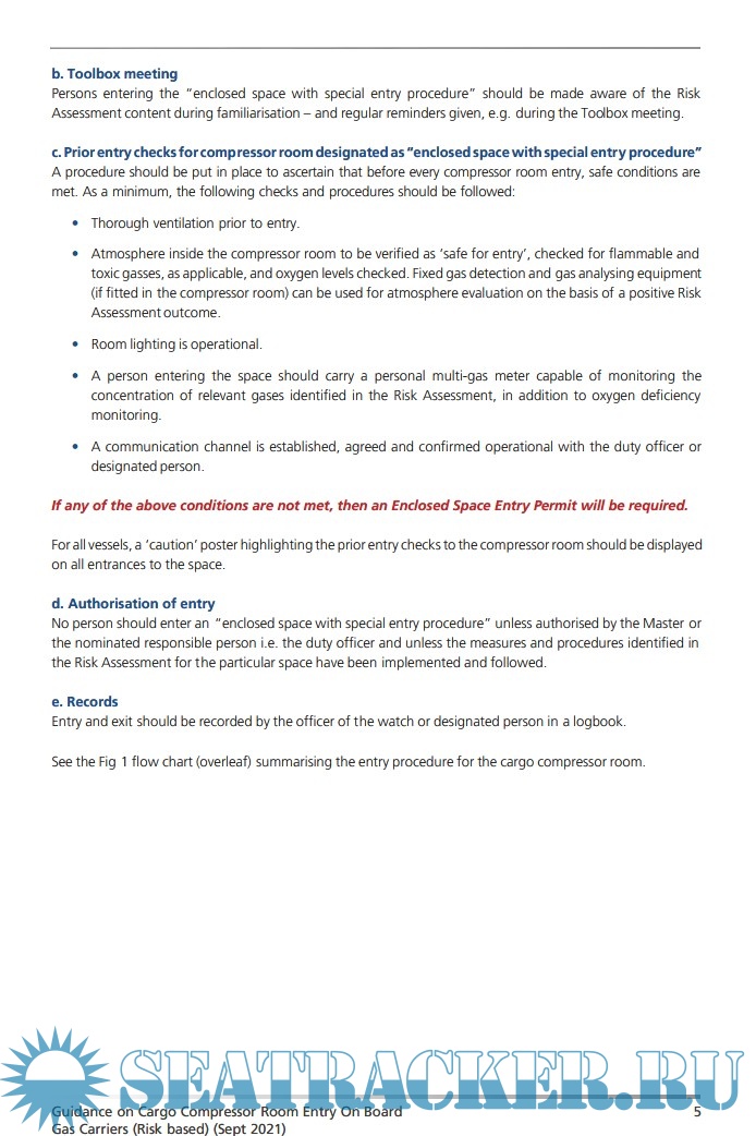 Description: Recognising the safety benefits of the existing mandatory requirements for ventilation, openings for entry and exits, and gas detection system applicable to compressor rooms design and features, this document provides advice on the safety measures to be put in place when entering cargo compressor rooms that have been risk assessed for entry without the need for an Enclosed Space Entry Permit, in the framework of a special entry procedure.