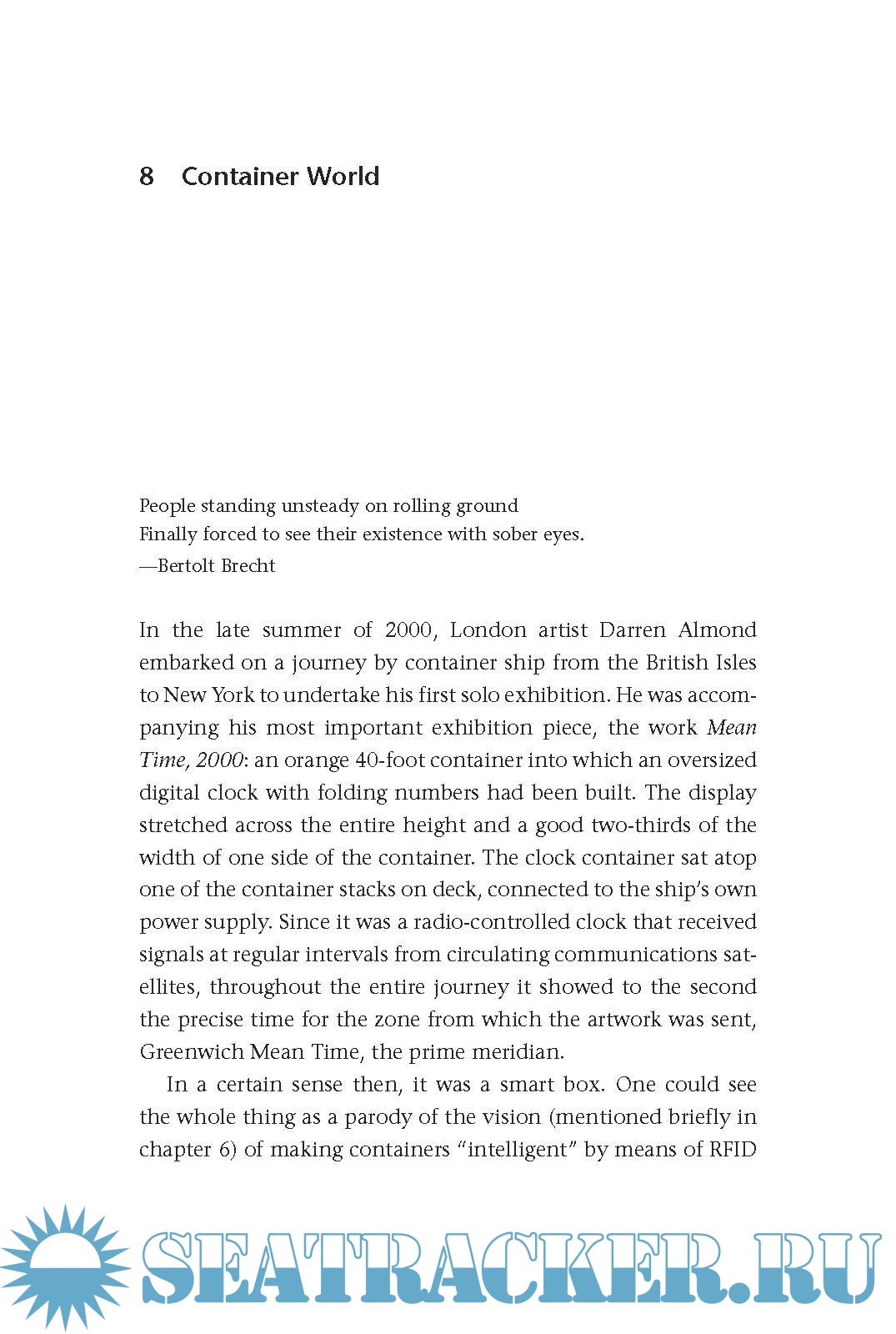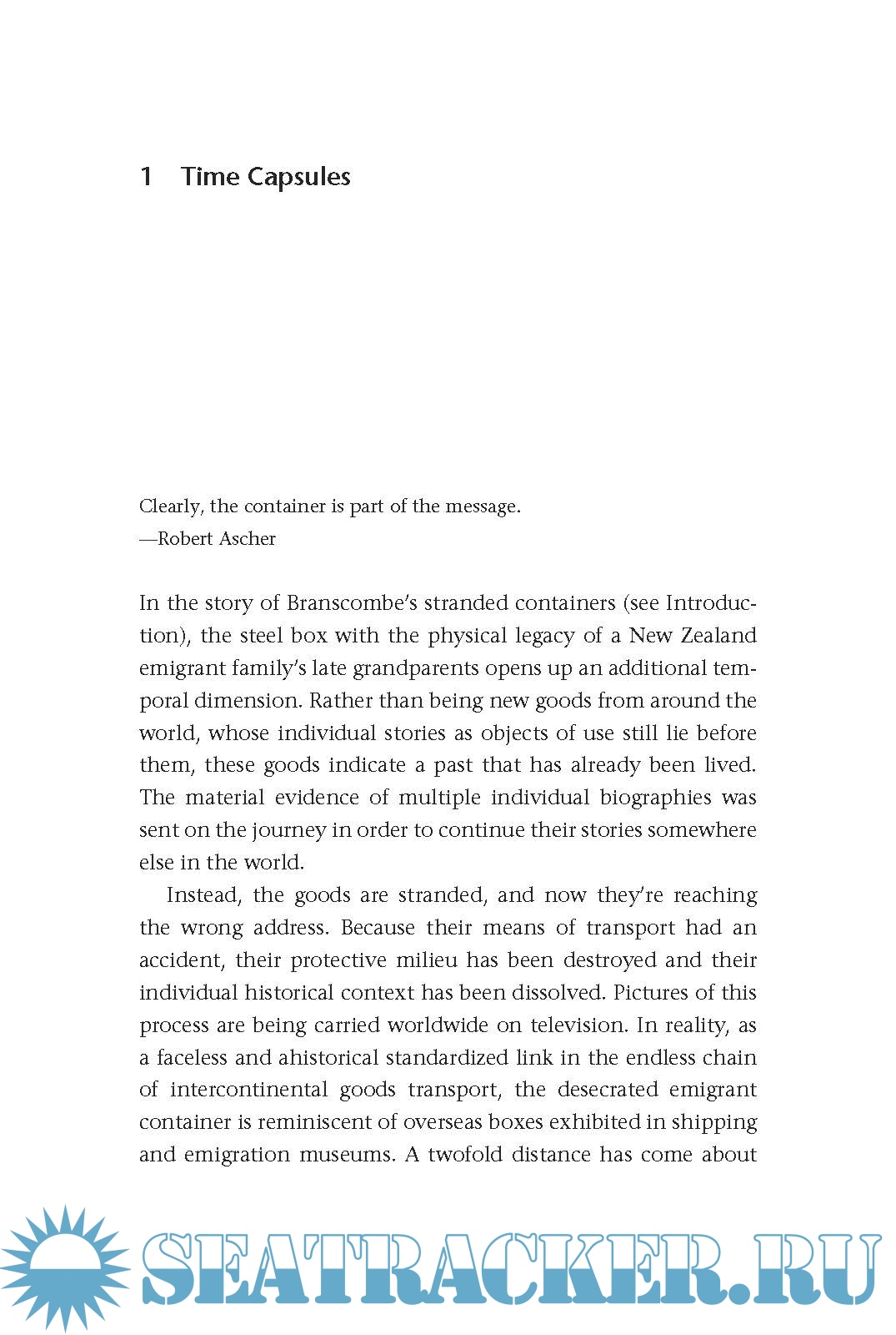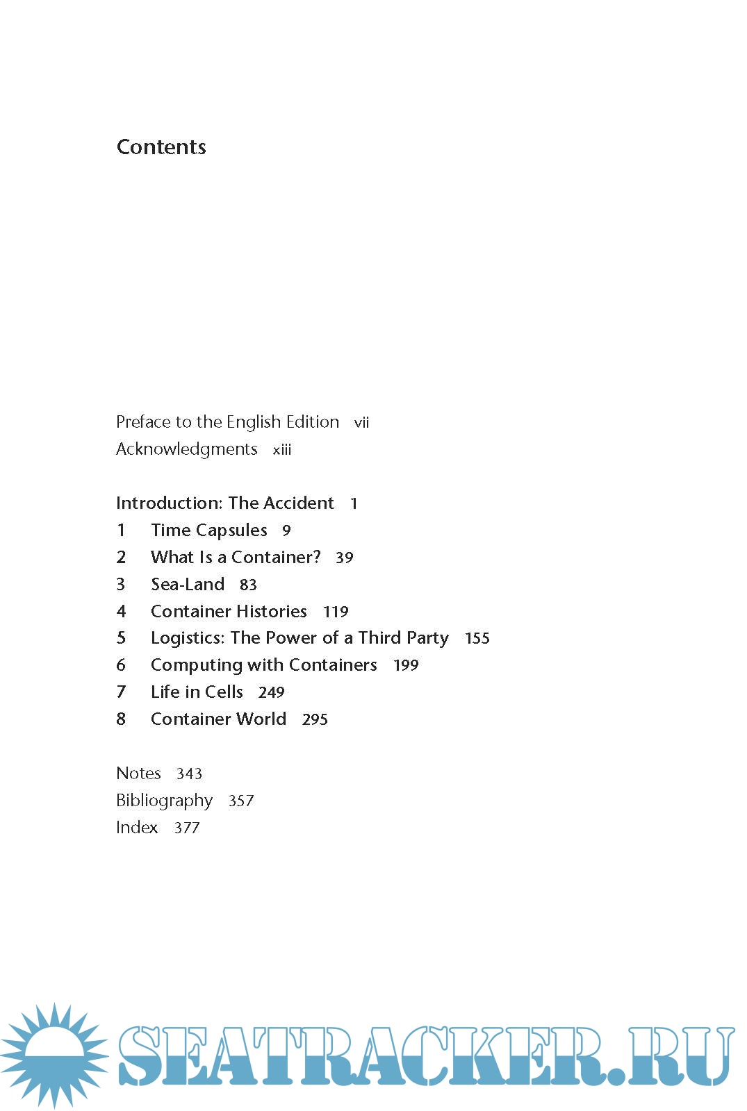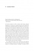 Klose explores a series of “container situations” in their historical, political, and cultural contexts. He examines the container as a time capsule, sometimes breaking loose and washing up onshore to display an inventory of artifacts of our culture. He explains the “Matryoshka principle,” explores the history of land-water transport, and charts the three phases of container history. He examines the rise of logistics, the containerization of computing in the form of modularization and standardization, the architecture of container-like housing (citing both Le Corbusier and Malvina Reynolds's “Little Boxes”), and a range of artistic projects inspired by containers. Containerization, spreading from physical storage to organizational metaphors, Klose argues, signals a change in the fundamental order of thinking and things. It has become a principle.