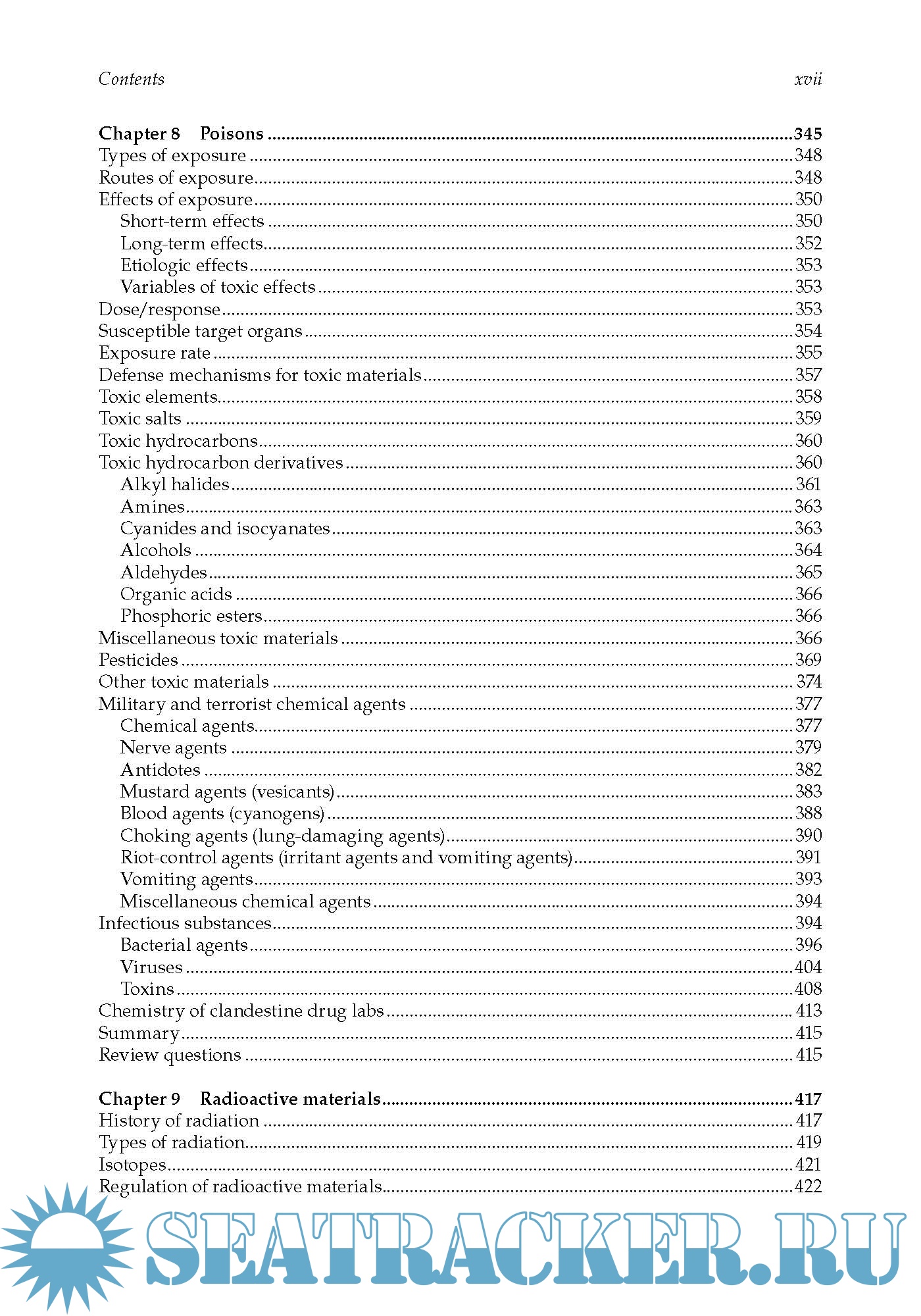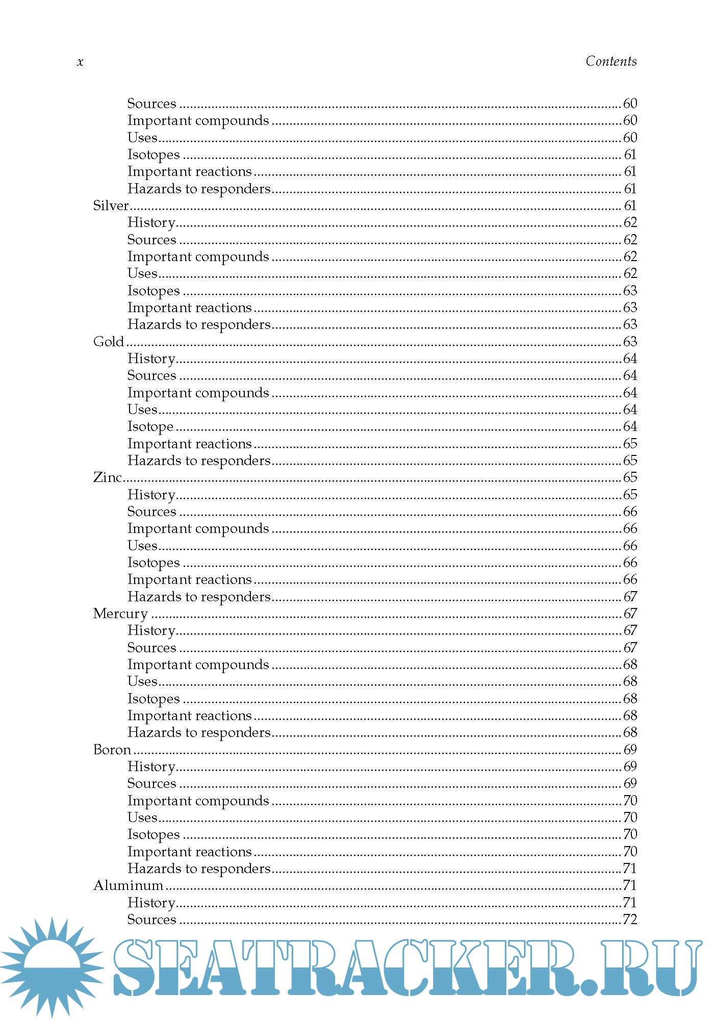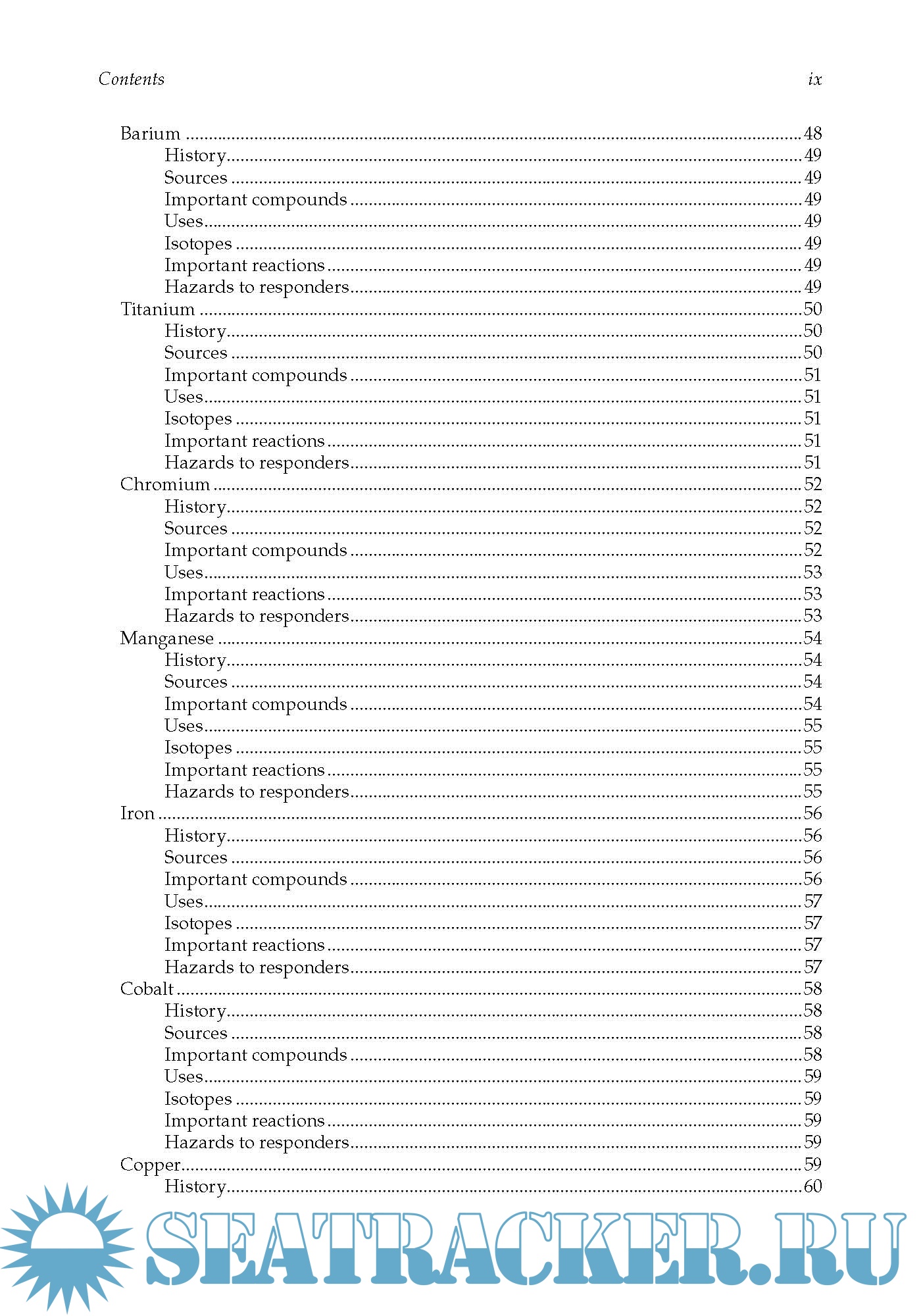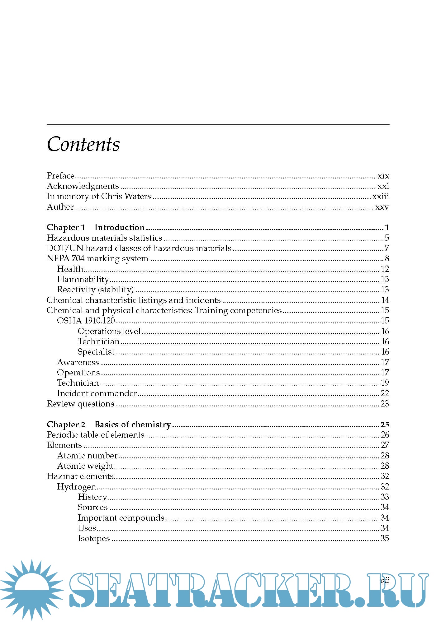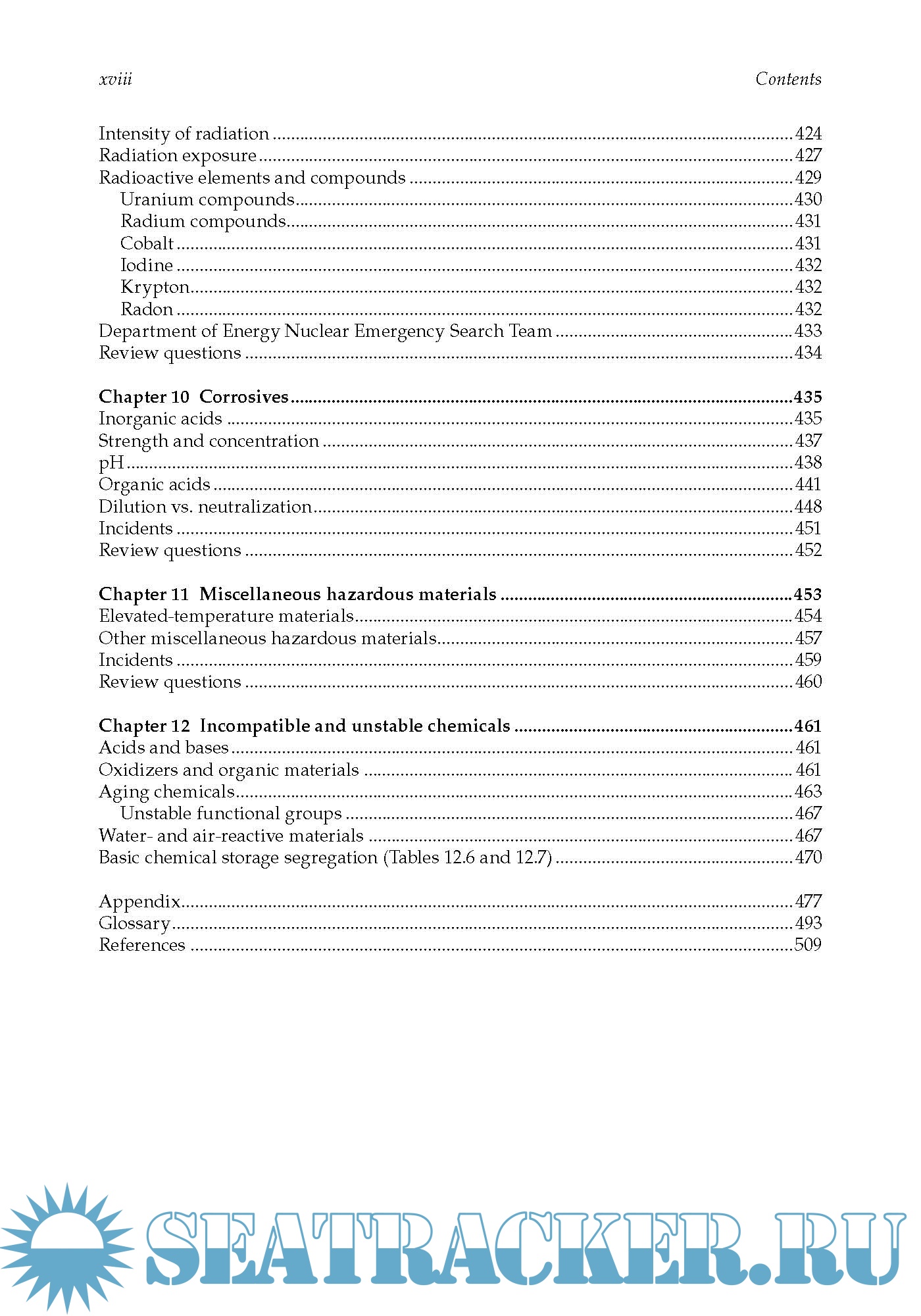 The chapters are organized by the nine U.S. Department of Transportation's hazard classes. Almost every hazardous material presents more than one hazard; the DOT’s placarding and labelling system only identifies the most severe hazards. Therefore, the book provides additional information about hidden hazards for each hazard class. It discusses individual chemicals, their hazards and their physical and chemical characteristics, both as distinct chemicals and within chemical families.