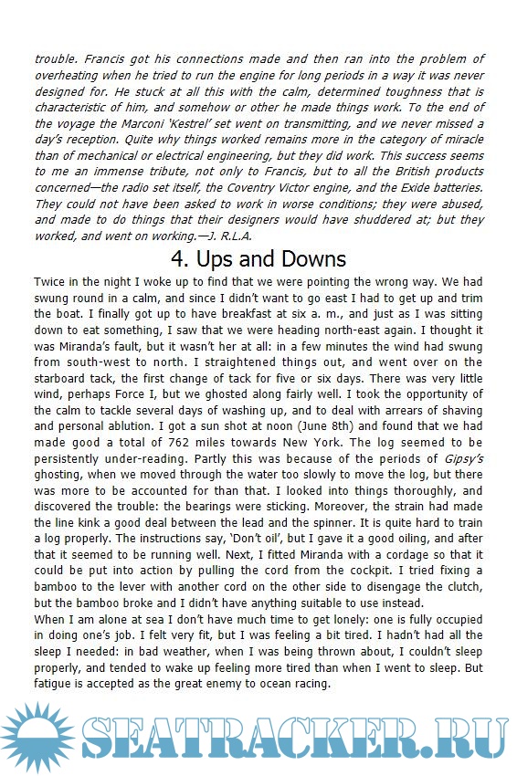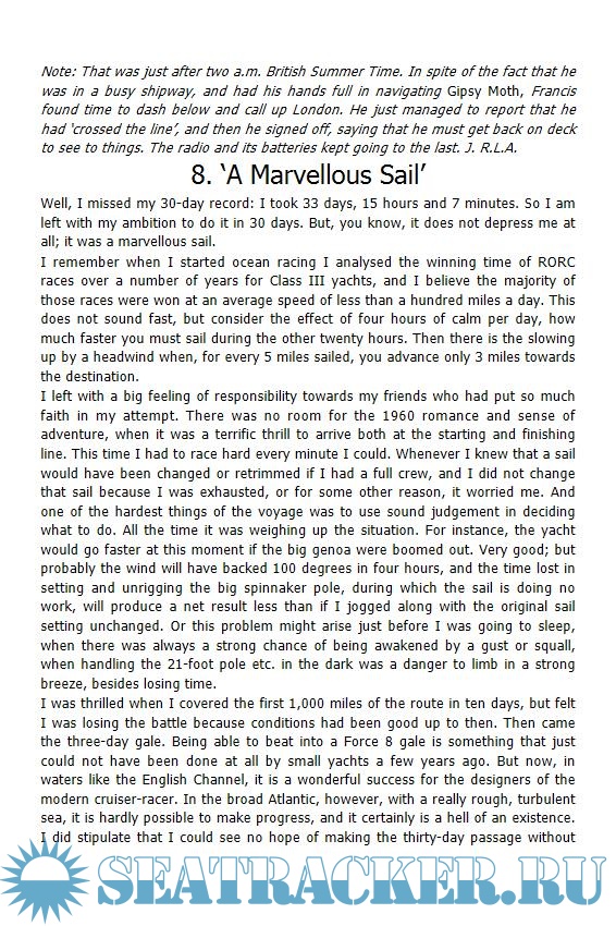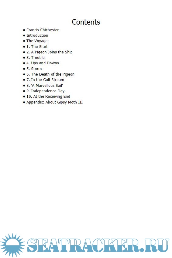 Year: 2012 Language: english Author: Chichester F. Genre: History Publisher: Bello ISBN: 1447234103 Format: EPUB Quality: eBook Pages count: 74 Description: In June 1962 Francis Chichester set out from Plymouth once again to cross the Atlantic single-handed in his 13-ton yacht, Gipsy Moth III, in an attempt to beat the 40-day record he set up himself in 1960. He succeeded, and knocked nearly a week off his previous time. Chichester also made history on his voyage by keeping in daily contact with Britain by means of a small battery-operated radio-telephone which enabled The Guardian, the sponsors of the voyage, to publish daily extracts from his log. Edited by The Guardian's Yachting Editor, J. R. L. Anderson, this book, Chichester's own day-by-day narrative of that adventurous journey, threatened by gales, icebergs and fog, is the drama of one man fighting his way alone across the North Atlantic. It is one of the great stories of the sea.'a magnificent achievement' Guardian'hard to put down' Times Literary Supplement'good-natured, informal and totally unpretentious book' Observer Additional info: About the Author Aviator and sailor Sir Francis Chichester is best known for being the first and fastest person to sail around the globe single-handedly in The Gipsy Moth IV. Following this achievement he wrote several books and made films about his sailing experiences. Born in Devon and educated at Marlborough College, Chichester emigrated to New Zealand at the age of 18 and spent ten years in forestry, mining and property development. On his return to England he learned to fly, and in the original Gipsy Moth seaplane he became the first person to complete an East-West solo flight across the Tasman Sea, for which he was awarded the inaugural Amy Johnson Memorial Trophy. Chichester wrote many popular books on his air adventures, and during WWII he wrote the manual that single-man fighter pilots used to navigate across Europe. In 1964 Chichester published his autobiography, the bestselling The Lonely Sea and the Sky, and was knighted three years later for 'individual achievement and sustained endeavour in the navigation and seamanship of small craft'. Chichester used his navigation experience to create a successful map-making company, Francis Chichester Ltd, which today still publishes pocket guides and maps which are sold throughout the world.