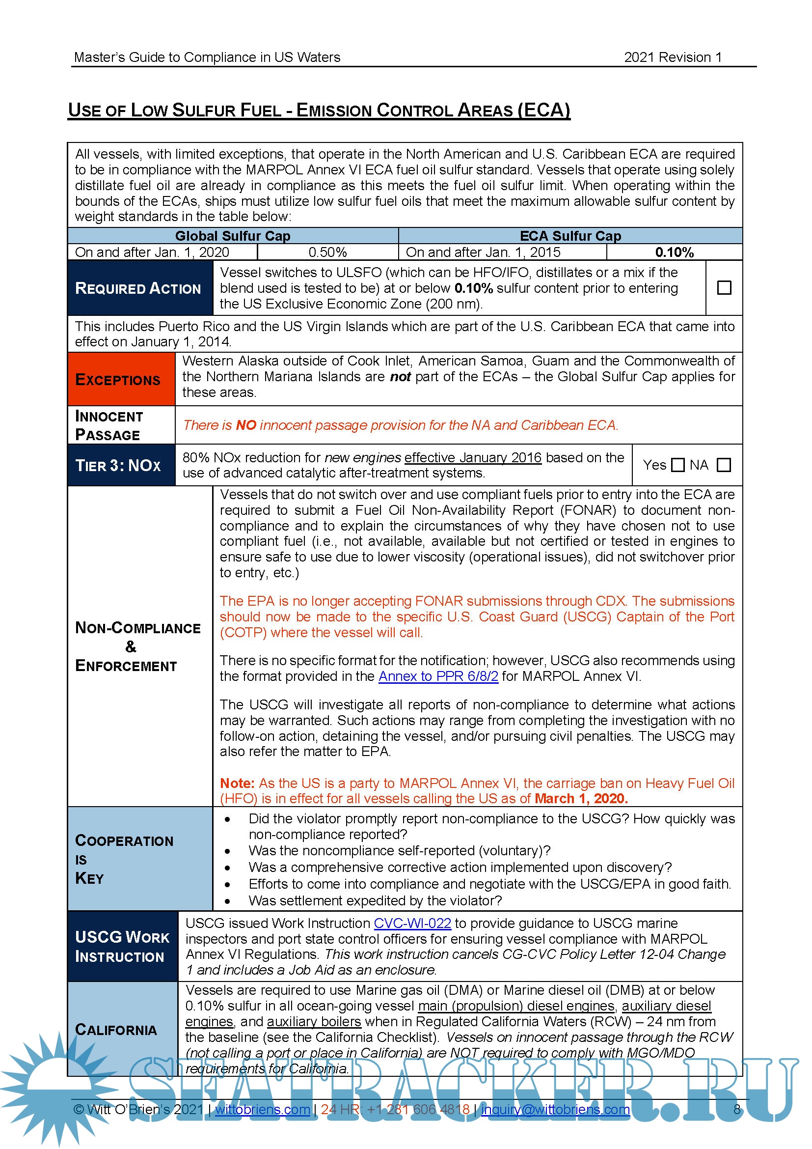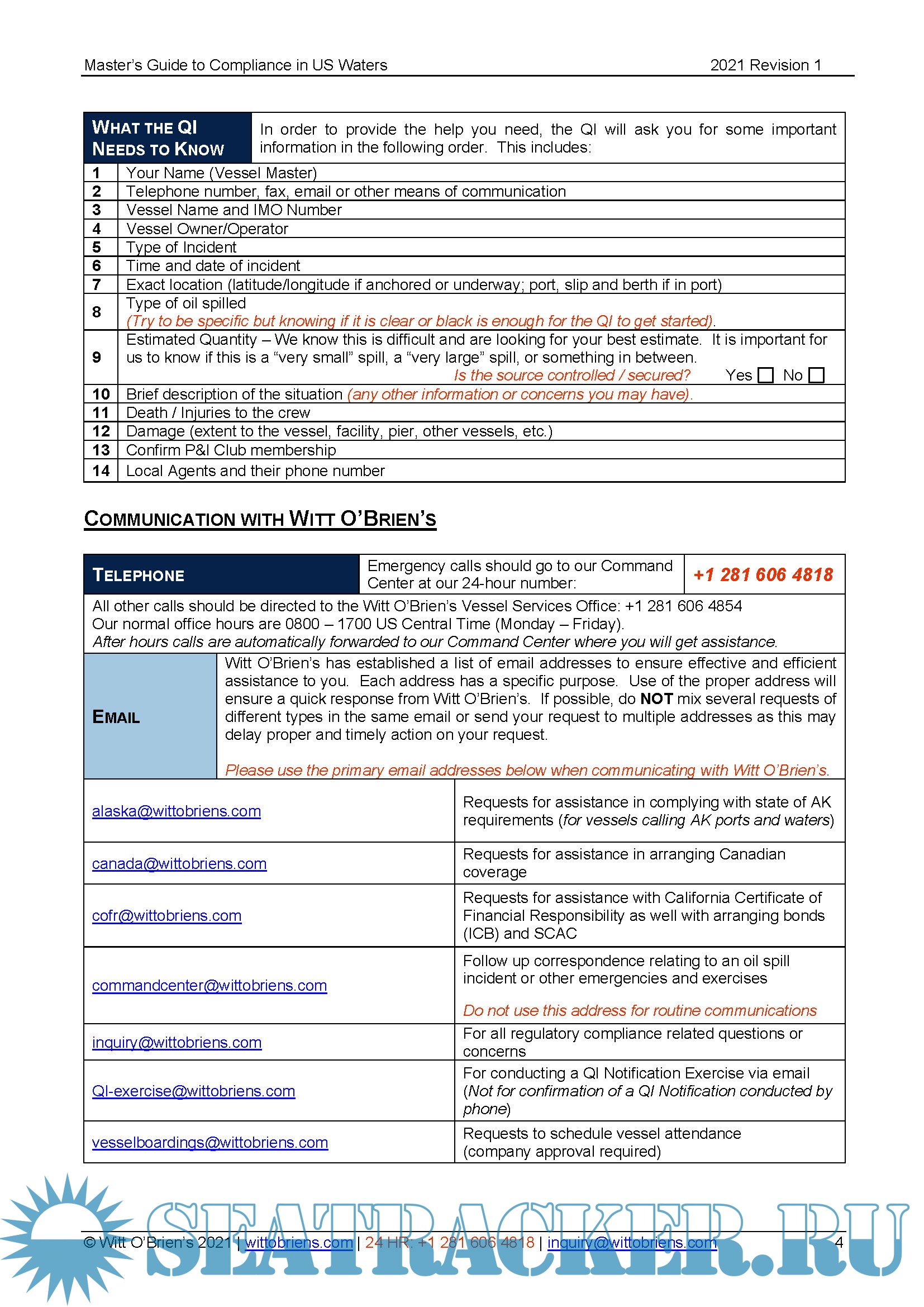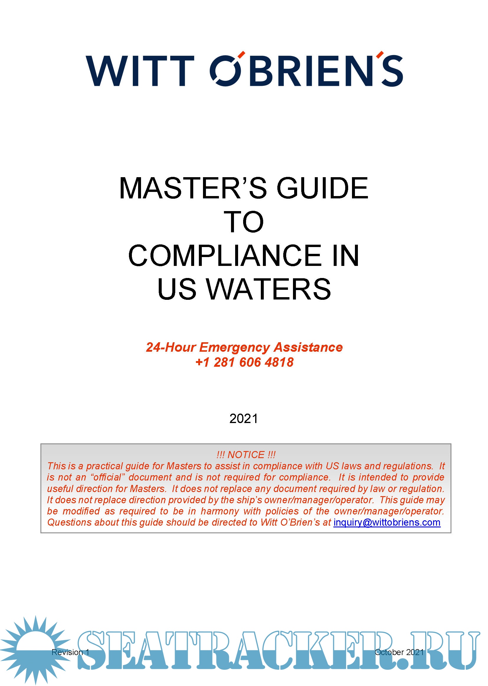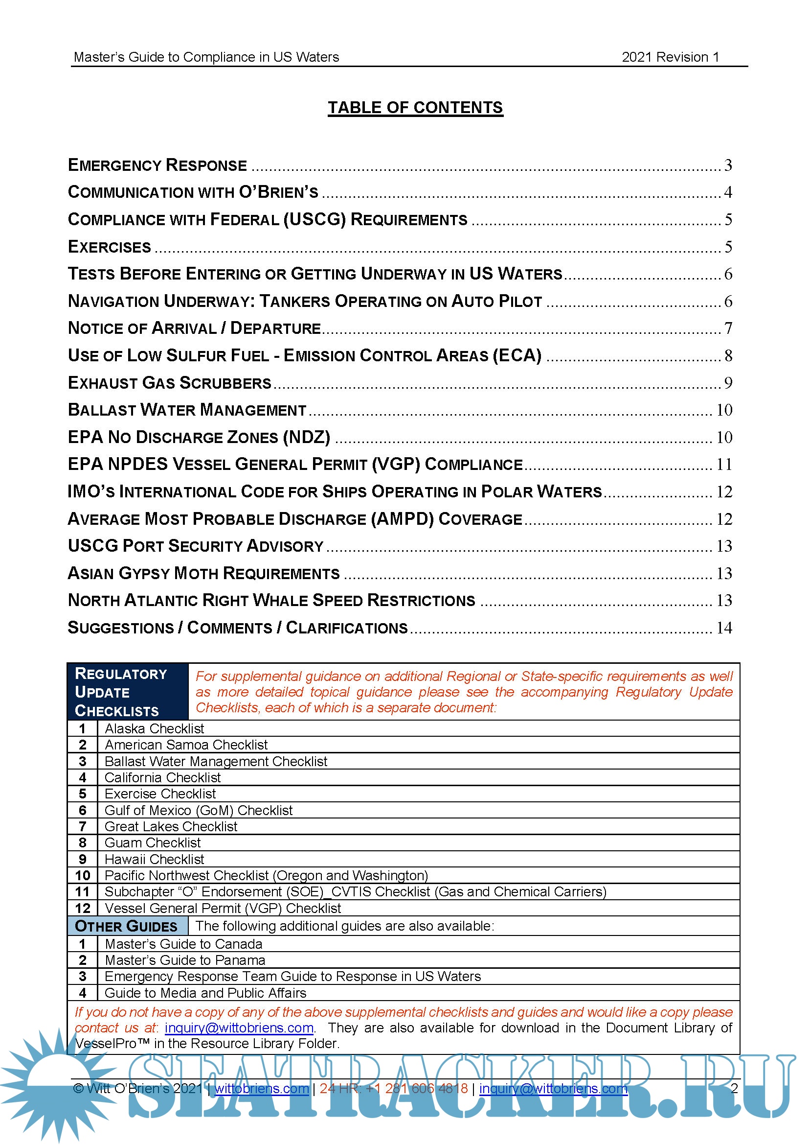 Year: 2021 Language: english Author: Witt O'Brien's Genre: Guide Format: PDF Quality: eBook Pages count: 14 Description: NTRODUCTION: The Master of any vessel making a call to the United States faces several regulatory issues that are specific to the US. Your vessel is enrolled with Witt O’Brien’s to ensure compliance with multiple US, federal, and state regulations. This guide is intended to help the Master effectively and efficiently face these issues. Use of the directions in the guide will allow Witt O’Brien’s to better serve you. Information designed to save you time and effort is present in orange italics.