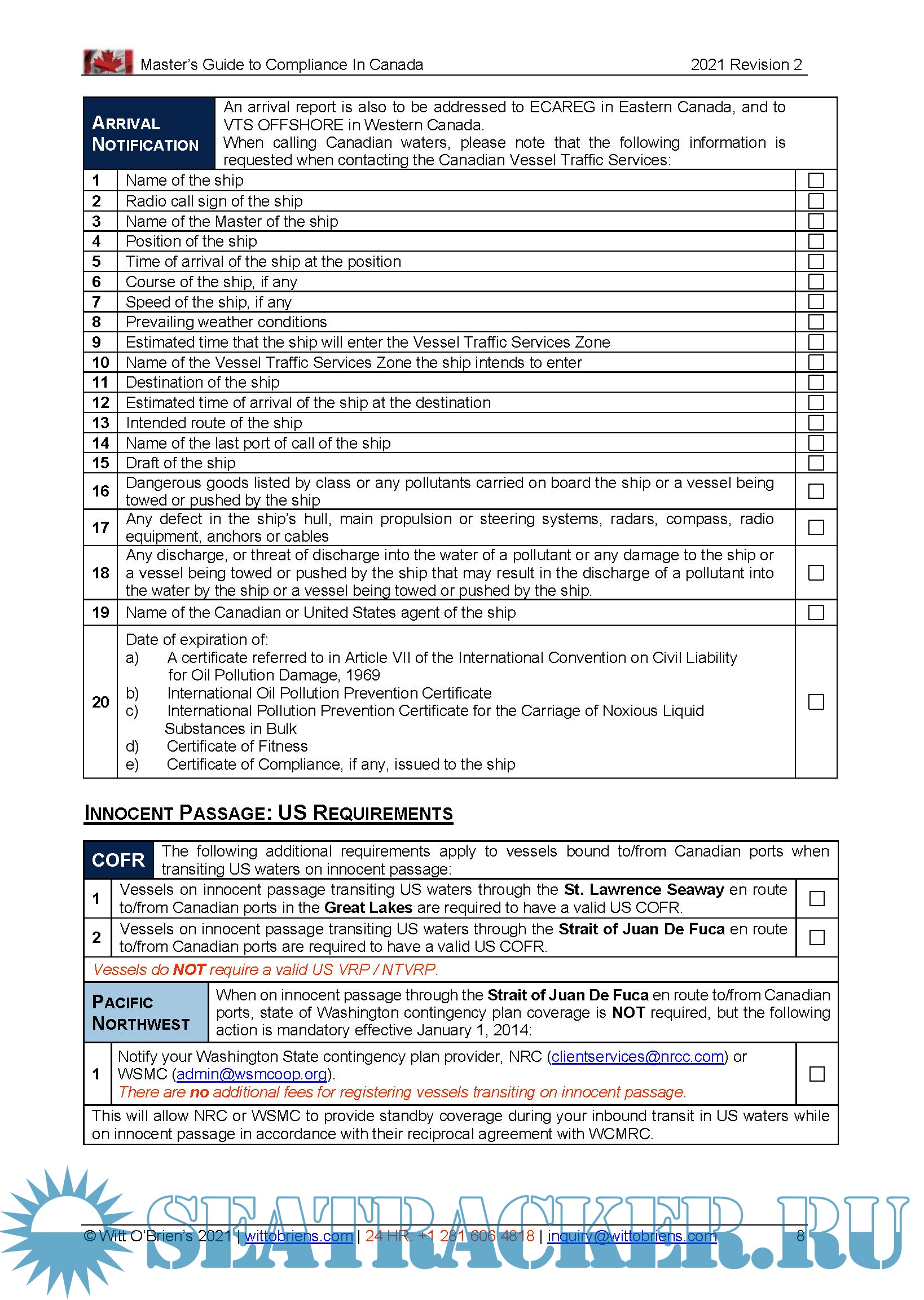 Year: 2021 Language: english Author: Witt O'Brien's Genre: Guide Format: PDF Quality: eBook Pages count: 15 Description: Revision 2 dated October 2021 of Master's Guide to Compliance in Canada This is a practical guide for Masters to assist in compliance with Canadian laws and regulations. It is not an “official” document and is not required for compliance. It is intended to provide useful direction for Masters. It does not replace any document required by law or regulation. It does not replace direction provided by the ship’s owner/manager/operator. This guide may be modified as required to be in harmony with policies of the owner/manager/operator. The Master of any vessel making a call to Canada faces several regulatory issues that are specific to Canada. This guide is intended to help the Master effectively and efficiently face these issues. Witt O’Brien’s is providing this guide to help ensure your compliance. Use of the directions in the guide will allow Witt O’Brien’s to better serve you. Information designed to save you time and effort is present in orange italics