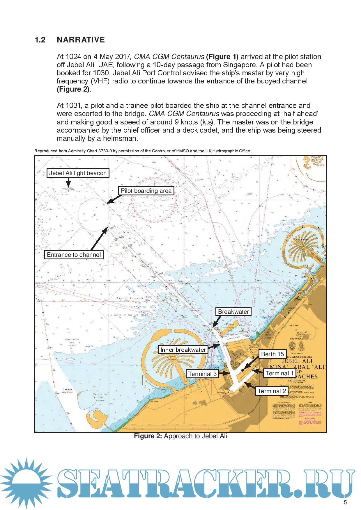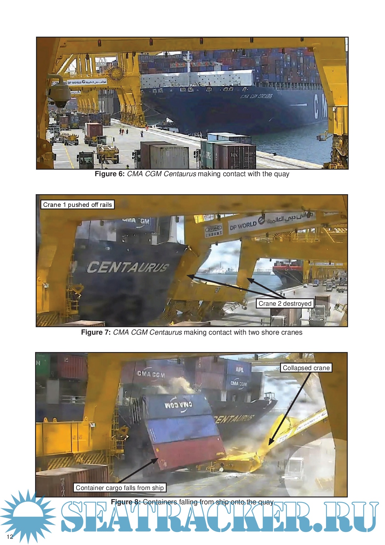 Description: At 1137 on 4 May 2017, the UK registered container ship CMA CGM Centaurus made heavy contact with the quay and two shore cranes while executing a turn under pilotage during its arrival at Jebel Ali, United Arab Emirates. The accident resulted in the collapse of a shore crane and 10 injuries, including one serious injury, to shore personnel.
