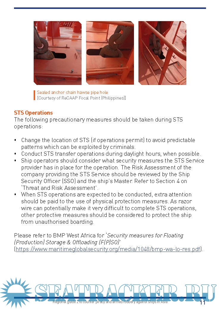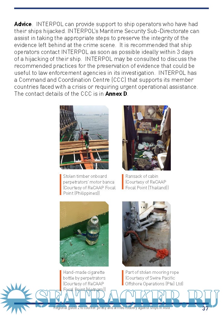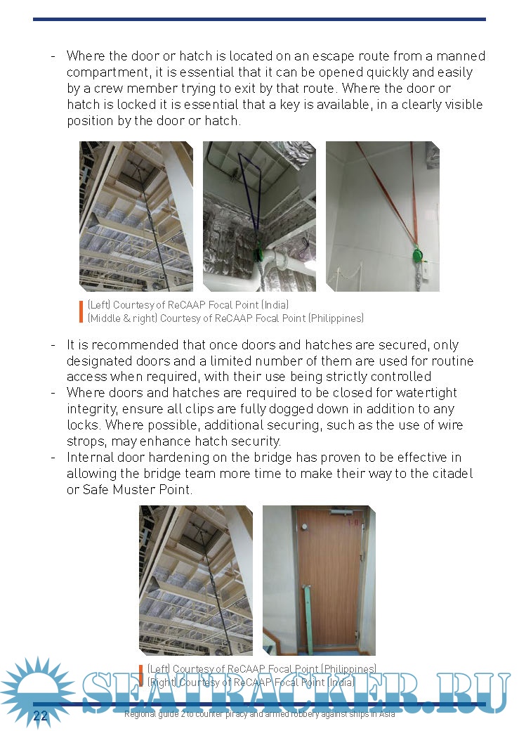 Year: 2022 Language: english Author: ReCAAP Genre: Guide Edition: 2nd (1 March 2022) Format: PDF Quality: eBook Pages count: 62 Description: The purpose of this guide is to assist those responsible for the operation of ships trading in Asia including companies, owners, masters, agents and seafarers in avoiding attacks, deterring attacks and delaying attacks, actions when attacked and evidence preservation.
