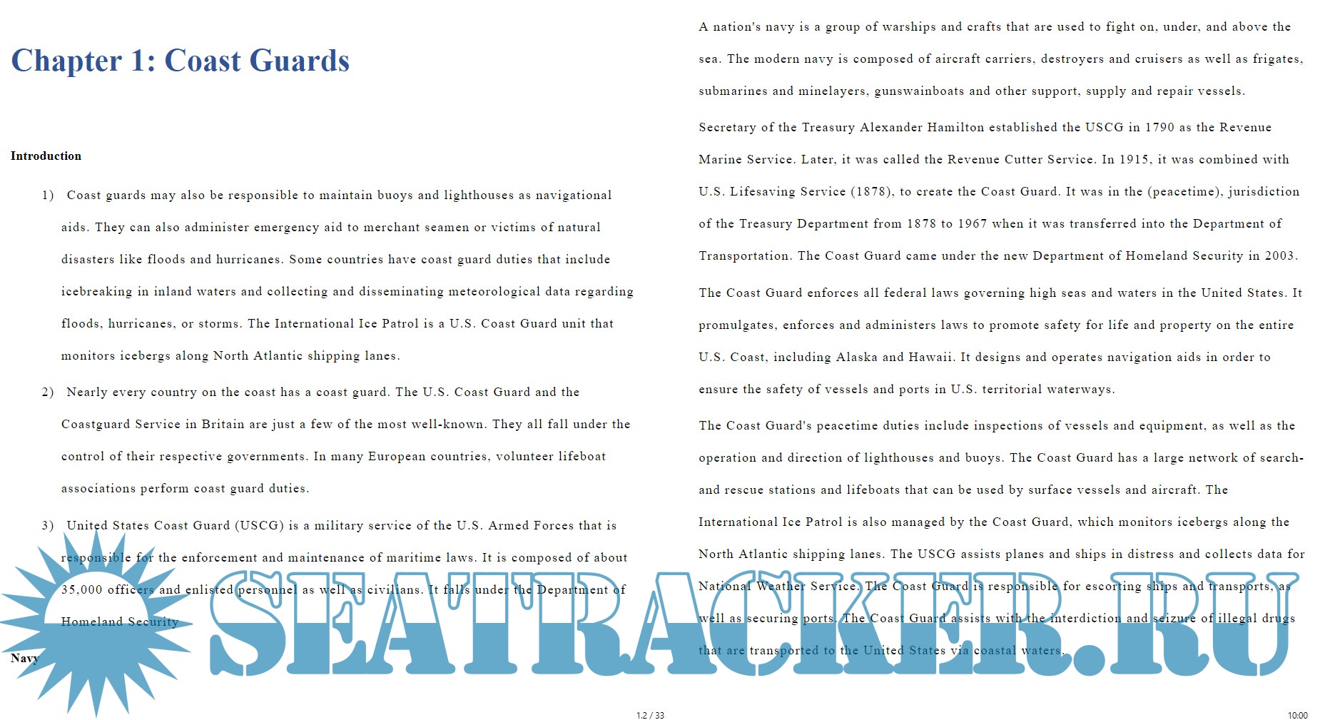 United States Coast Guard (USCG) is a military service of the U.S. Armed Forces that is responsible for the enforcement and maintenance of maritime laws. It is composed of about 35,000 officers and enlisted personnel as well as civilians. It falls under the Department of Homeland Security