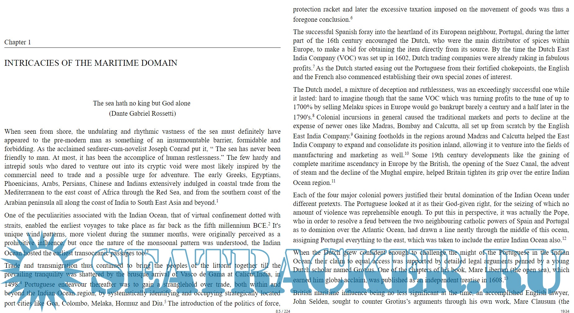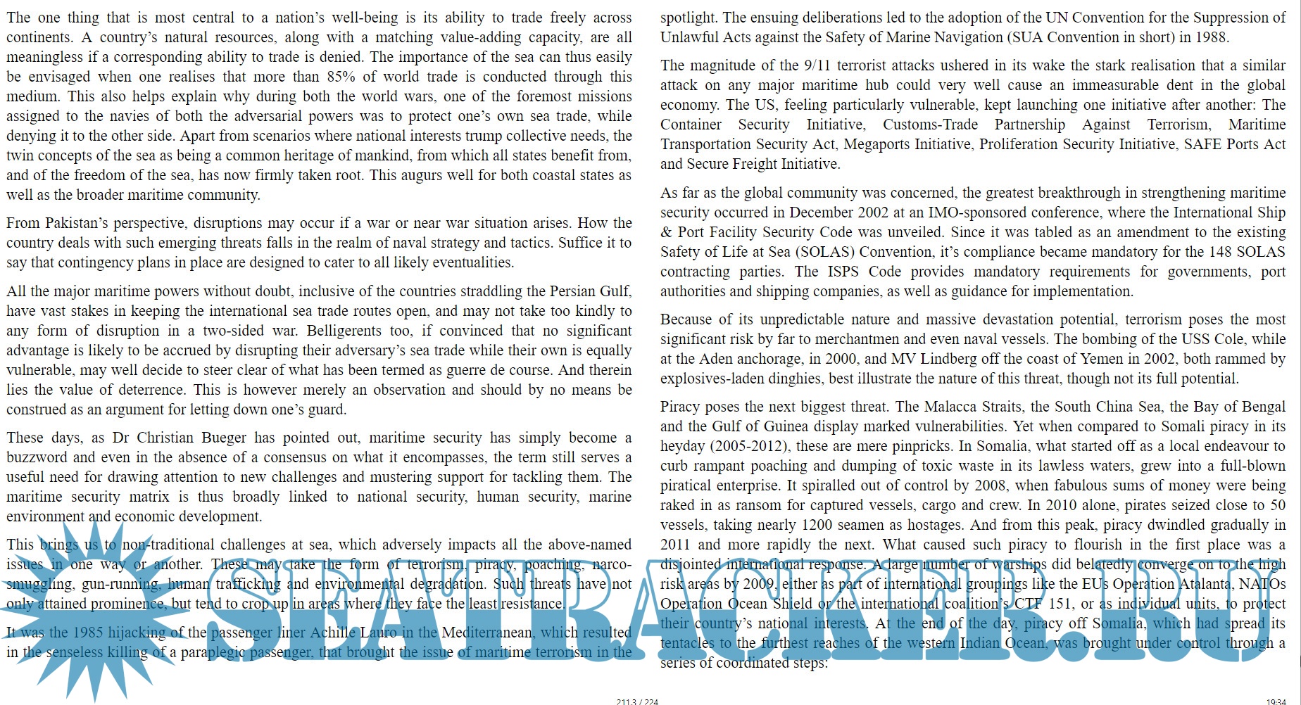 Year: 2021 Language: english Author: Pervaiz Asghar Format: EPUB Quality: eBook Pages count: 224 Description: From an historical perspective, activities at sea can be characterised by coastal trade, transoceanic passages, piracy, subjugation, profiteering and colonisation, a subsidiary objective being the gaining of ascendency on land. The maritime field has over time undergone a drastic transformation, both on the military and non-military fronts. Amongst a horde of other activities, sea connectivity and trade take pride of place as drivers of the global economy. The International Maritime Organisation, which cobbled together the UN Convention on Law of the Sea in 1982, assists in the crafting of much-needed maritime conventions to fulfil the vital need of establishing universally acceptable standards for maritime safety, security and environmental protection. Present day maritime activities and processes now fall under the all-enveloping term ‘Maritime Domain’, and thus ‘Maritime Domain Awareness’ becomes a prerequisite for the materialisation of maritime aspirations. Pakistan is admittedly a coastal state but before it can even dream of becoming a maritime power, it has to shed off its historical baggage and stand prepared to overhaul its manner of doing business by creating an autonomous, effective and efficient administration. A dedicated and fully functional maritime administration is the key to looking after a state’s maritime interests, inclusive of the international obligations required of a flag state, as well as the judicial exercise of Port State Control. Being a signatory to more than two dozen odd international maritime conventions, Pakistan can only satisfactorily meet its national and international obligations if it is professionally geared to do so, which it obviously isn’t, as the near absence of any domestic maritime legislation (a prerequisite for most follow-up actions) shows. In a domain constantly in flux, stagnancy is not an option. Changes within have to be brought about, administratively, operationally and functionally, to cater to the changes without. This forms the crux of the problem standing in the way of the country transitioning from a coastal state to a responsible coastal state to a successful maritime power. This book has been designed to generate awareness about the intricacies of the maritime domain, a deep understanding of which is essential to the formulation and execution of a clear-headed policy. Additional info: About the author: Rear Admiral Pervaiz Asghar HI (M) (Ret.) is a graduate of the Pakistan Naval Academy. During his eventful naval career, spanning nearly four decades, he held command of Hydrofoils, Fast Attack Craft and two destroyers (an ex-USN Brooke Class and an ex-RN Type 21), prior going on to command the 25th Destroyer Squadron. He also did a 3-year post-retirement stint as the Director General of the National Centre for Maritime Policy Research, Bahria University Karachi Campus. He has written extensively on maritime, naval and national security issues, with his articles being published in various newspapers and magazines.