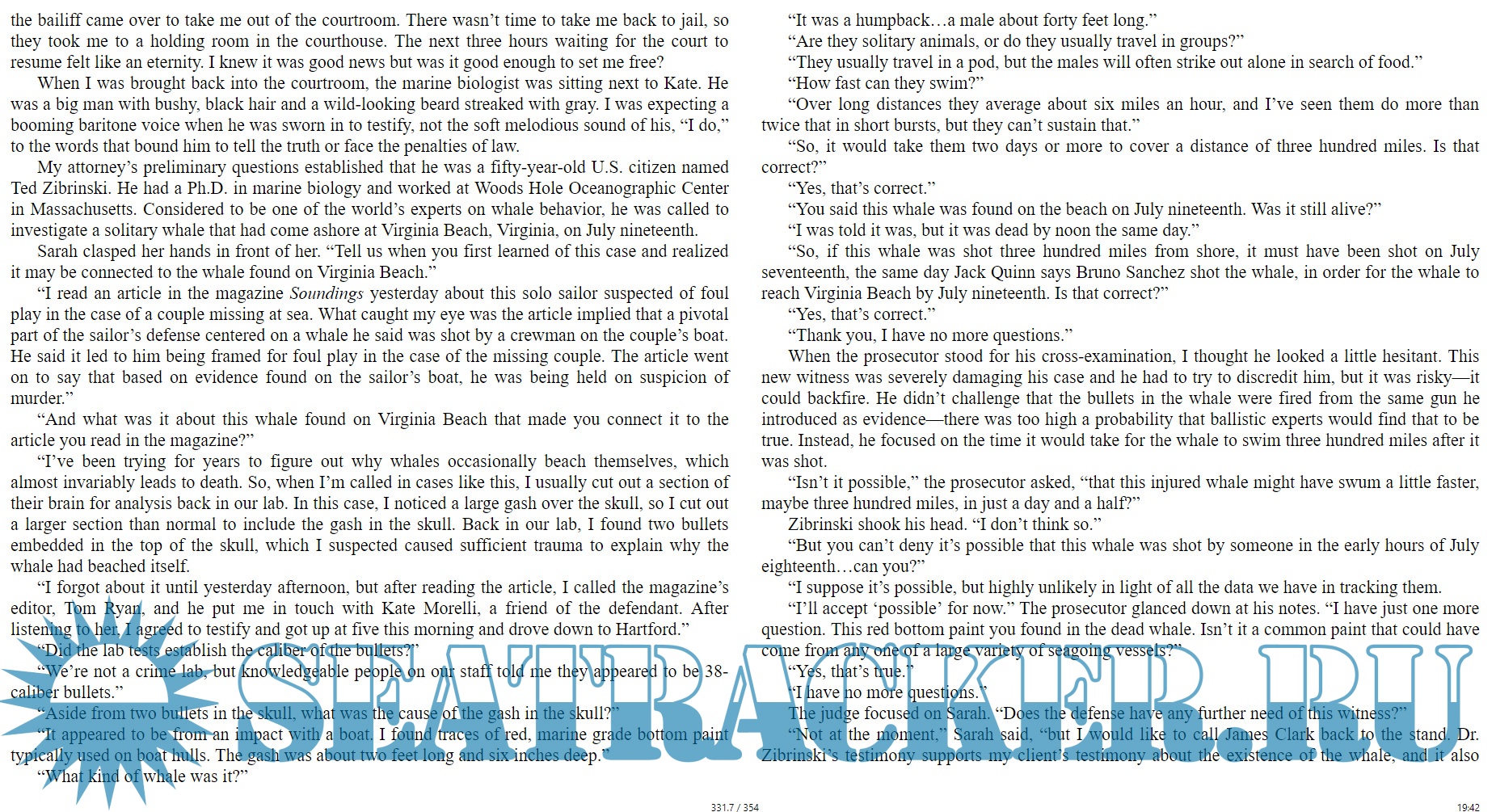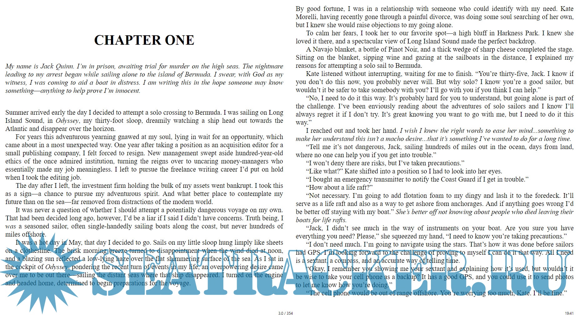 Year: 2016 Language: english Author: Pat Wiley Genre: Fiction Publisher: First Steps Publishing Edition: 1st (Revised) ISBN: 978-1-937333-25-6 Format: EPUB Quality: eBook Pages count: 354 Description: My name is Jack Quinn. I’m in prison, awaiting trial for murder on the high seas. The nightmare leading to my arrest began while sailing alone to the island of Bermuda. I swear, with God as my witness, I was coming to aid a boat in distress. I am writing this in the hope someone may know something––anything to help prove I’m innocent.***Freelance writer, Jack Quinn, has lost everything - his job, his life savings and now his freedom. What turned out to be an opportunity to fulfill his dream of sailing single- handed from New England to Bermuda has transformed into a nightmare. Barely surviving a hurricane, Jack offers aid to survivors on a dis-masted sailboat. But something is wrong. After arriving back to the mainland, Jack’s arrested and finds himself the prime suspect in an extensive FBI investiga- tion of smuggling, money laundering and murder. Overwhelming evidence mounts as Jack relies on two women, one of whom risks her life, to find corroborating evidence to his story and track down the only witness in his favor––a humpback whale.
