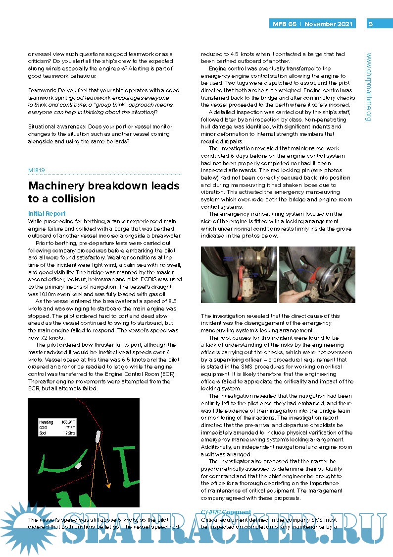 Year: 2021-2022 Language: english Author: CHIRP Maritime Genre: Periodical (magazine) Edition: issues 65/21 - 66/22 Format: PDF Quality: eBook Pages count: total 20 Description: An independent and confidential reporting system for the maritime industry. The Confidential Hazardous Incident Reporting Programme (CHIRP) Maritime reviews and investigates reports of hazardous incidents and near misses by providing an independent and confidential reporting system for the maritime industry. Britannia sponsors the translation of the quarterly CHIRP Maritime Feedback (MFB) into Filipino, aimed at improving Filipino seafarers’ understanding of CHIRP Maritime and to encourage them to report issues such as safety breaches, environmental issues, sexual harassment, bullying and health concerns. All notifications are handled in total confidence