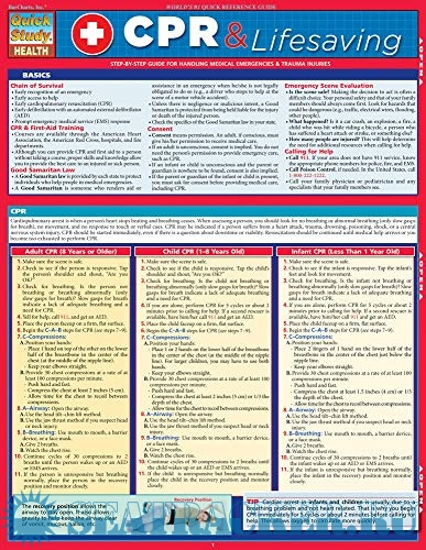 Description: Making the decision to help in an emergency situation is often a difficult choice. Be prepared for emergencies with the help of our CPR & Lifesaving QuickStudy® guide. Packed with quickly accessible information on different aspects of lifesaving, this go-to reference will help you respond effectively in an emergency until professional help arrives. Learn how to evaluate a scene, the steps in CPR and AED use, standard precautions, and other essential elements in the chain of survival. This durable, laminated guide also includes illustrations for easy understanding. Keep a copy in your home, with your camping gear, at your office, in your car, etc., so that you will always be prepared.