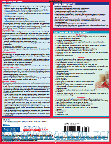 Year: 2018 Language: english Author: Shirley A. Jones Genre: Guide ISBN: 1423218612 Format: PDF Quality: eBook Pages count: 6 Description: Making the decision to help in an emergency situation is often a difficult choice. Be prepared for emergencies with the help of our CPR & Lifesaving QuickStudy® guide. Packed with quickly accessible information on different aspects of lifesaving, this go-to reference will help you respond effectively in an emergency until professional help arrives. Learn how to evaluate a scene, the steps in CPR and AED use, standard precautions, and other essential elements in the chain of survival. This durable, laminated guide also includes illustrations for easy understanding. Keep a copy in your home, with your camping gear, at your office, in your car, etc., so that you will always be prepared.