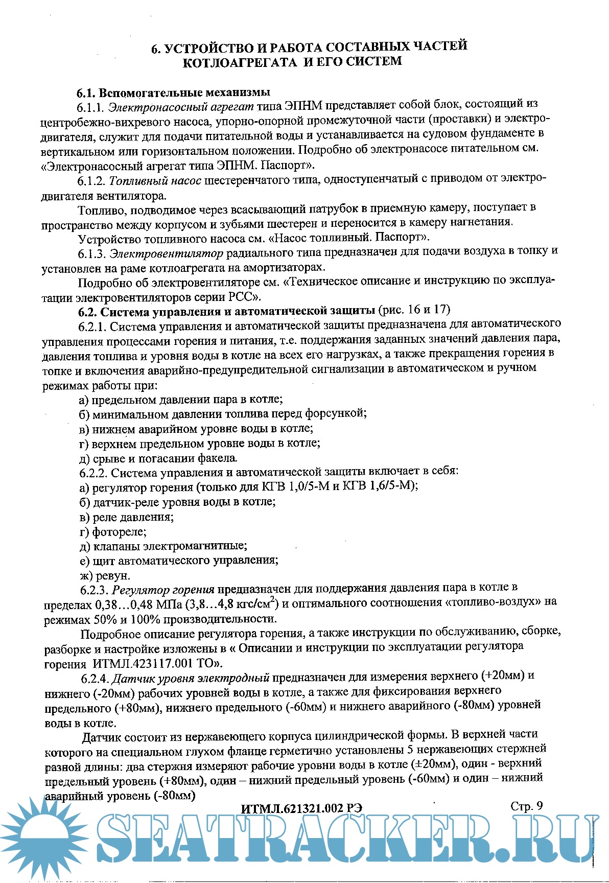 Описание: Котлоагрегаты вспомогательные паровые судовые автоматизированные газотрубные КГВ 0,25/3-М, КГВ 0,63/5-М, КГВ 1,0/5-М, КГВ 1,6/5-М. Настоящее руководство по эксплуатации является обязательным руководящим документом при обслуживании котлоагрегатов типа КГВ-М и предназначено для изучения устройств и правил их эксплуатации сцелью обеспечения полного использования технических возможностей котлоагрегатов и поддержания их впостоянной готовности к действию.