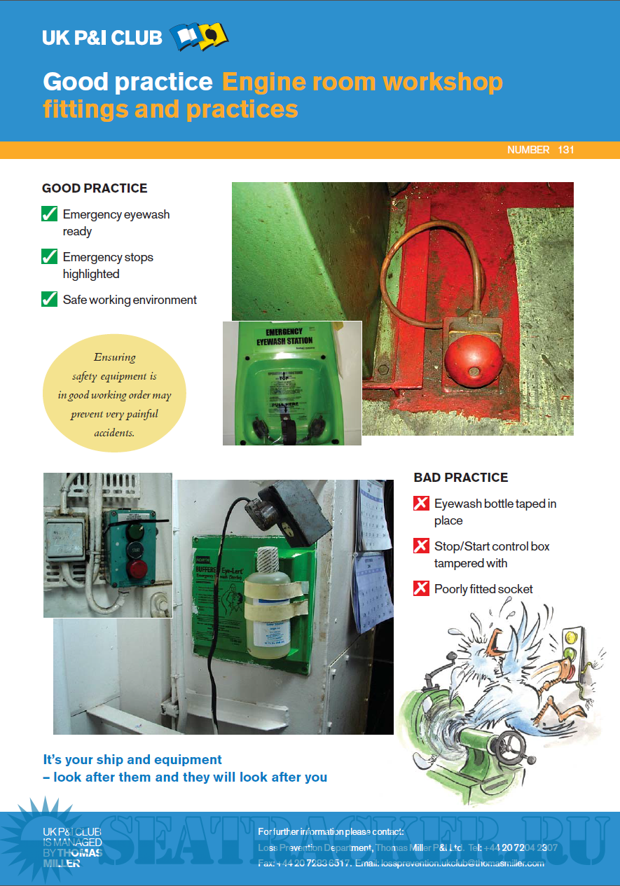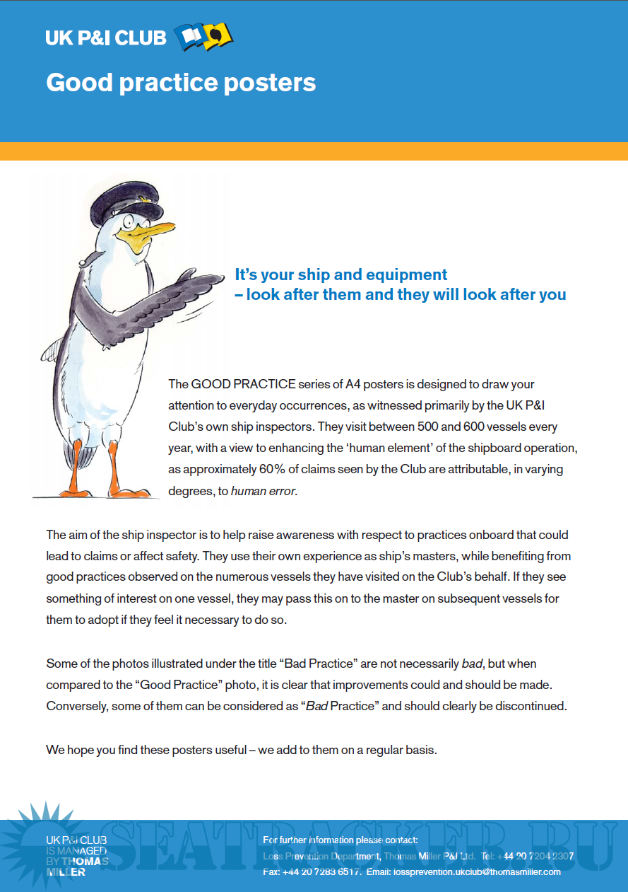 Description: The GOOD PRACTICE series of A4 posters is designed to draw your attention to everyday occurrences, as witnessed primarily by the UK P&I Club’s own ship inspectors. They visit between 500 and 600 vessels every year, with a view to enhancing the ‘human element’ of the shipboard operation, as approximately 60% of claims seen by the Club are attributable, in varying degrees, to human error.