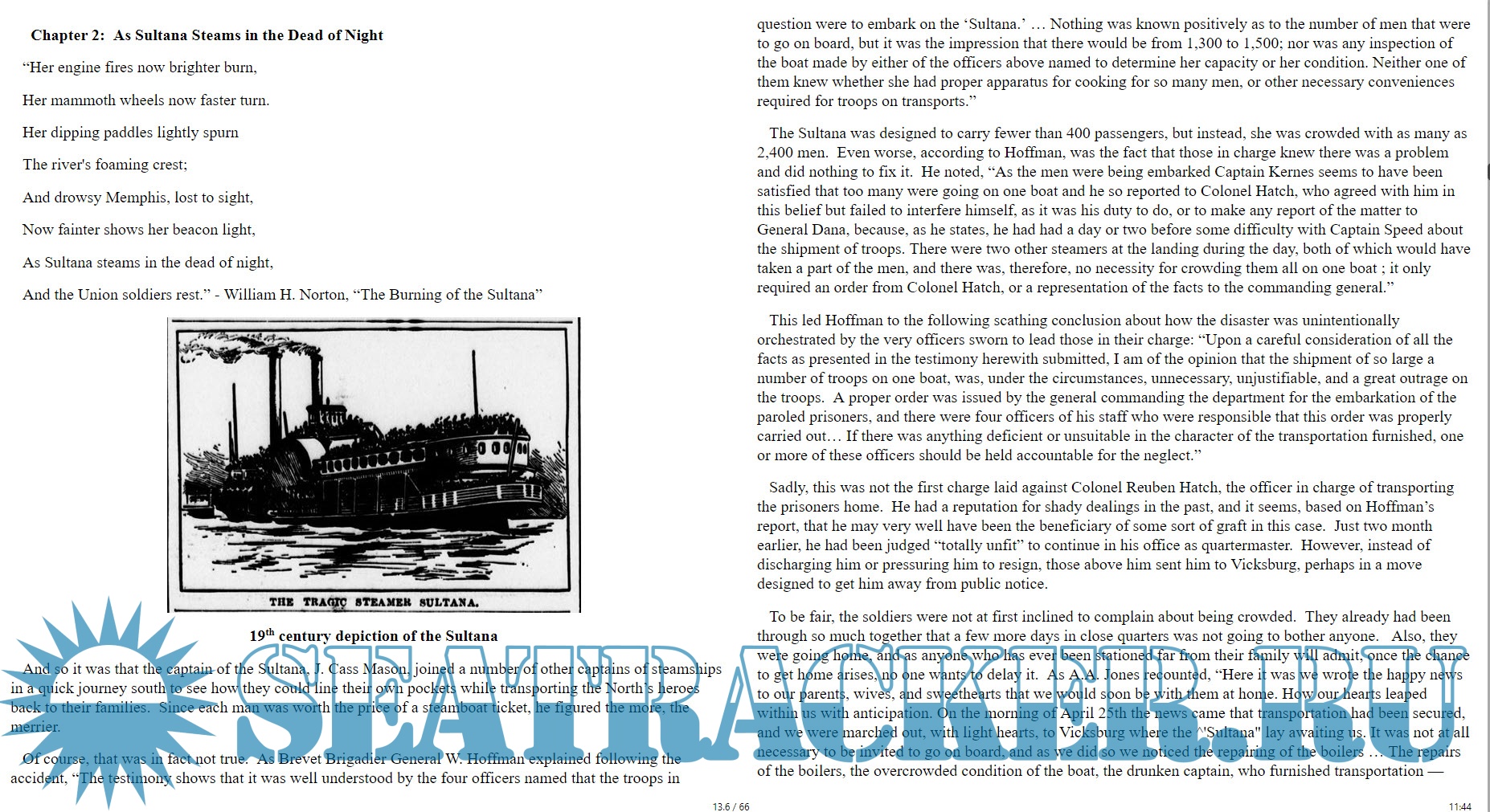 Description: There is a popular saying that declares “timing is everything,” and in no other field of study is that truer than in history. For instance, under normal conditions, a ship that sank with more than 2,000 passengers aboard – most of whom died – would be big news, yet today the sinking of the SS Sultana is often overlooked if not entirely forgotten. While it might have generated the type of publicity and reaction of the Johnstown Flood of 1889 or the Galveston Hurricane of 1900 under normal circumstances, the explosion and sinking of the Sultana on April 27, 1865 has become something of a historical footnote.