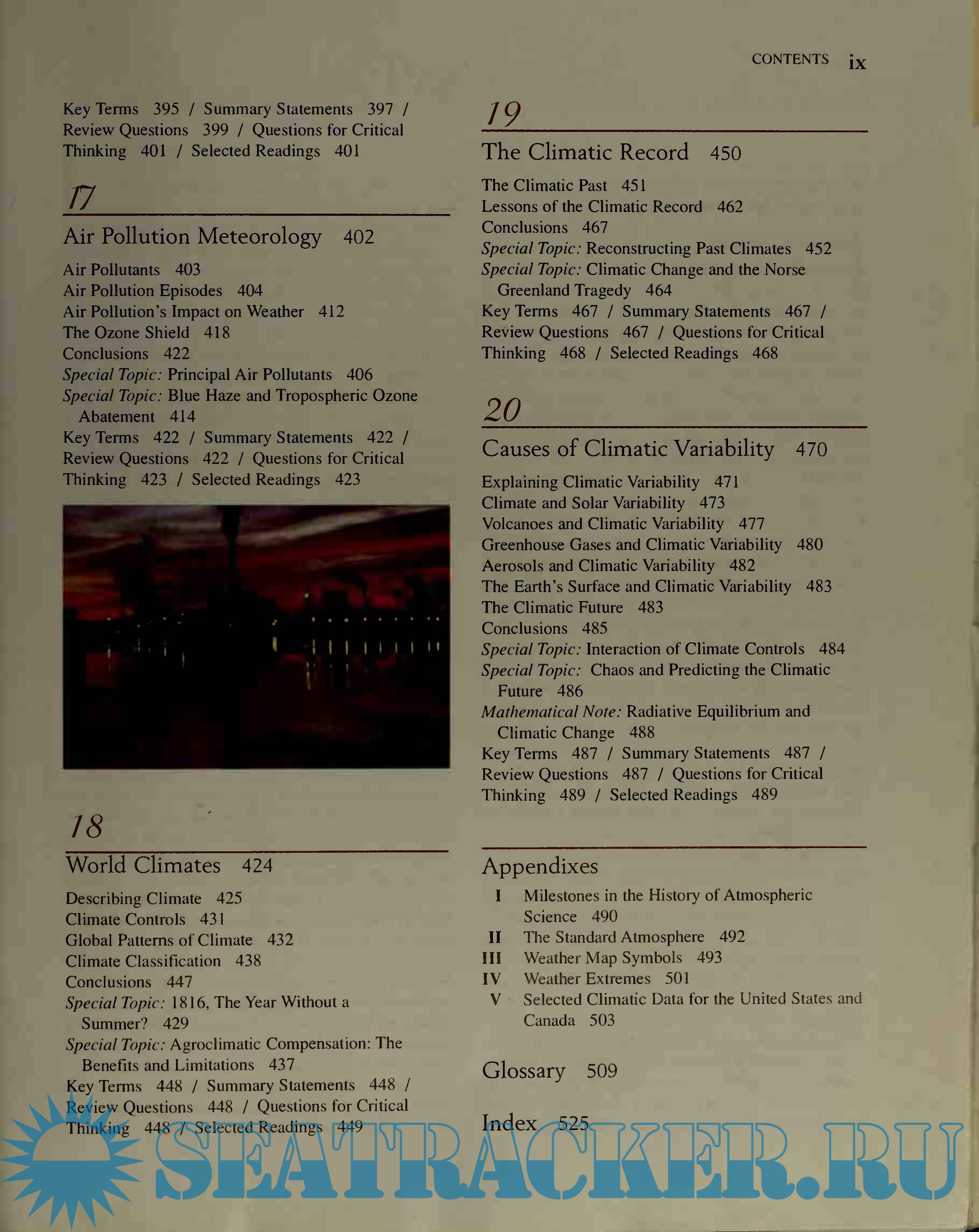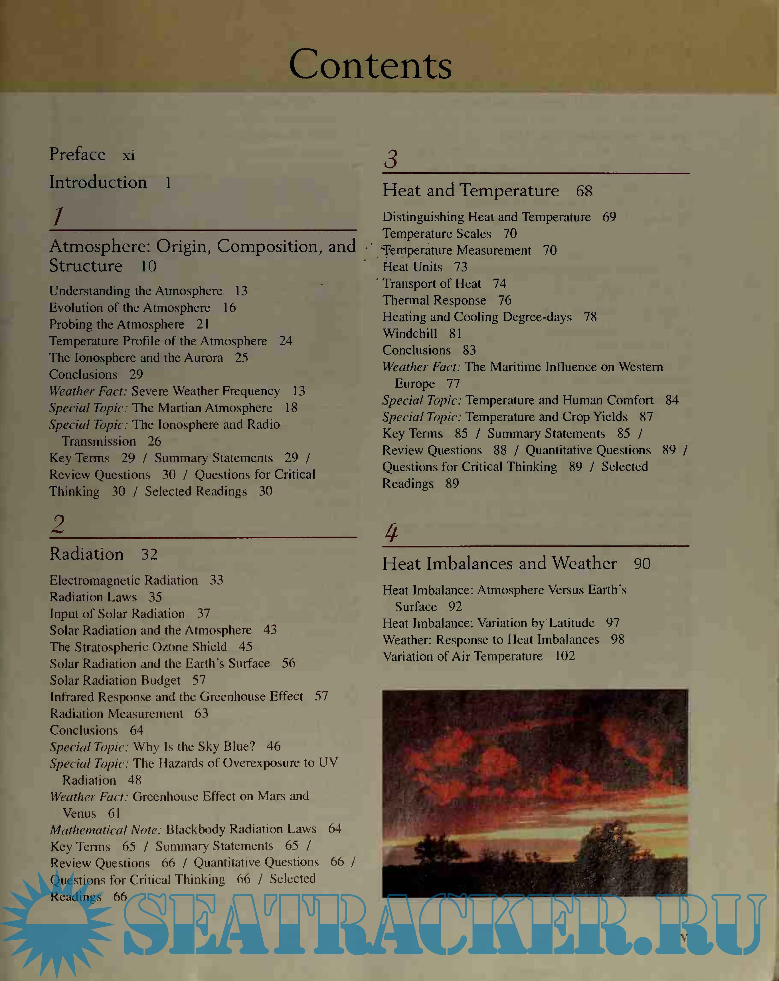Designed for non-science majors with little background in science or mathematics. The text integrates atmospheric aspects of contemporary environmental concerns with traditional coverage of the basics of meteorology/climatology and, at the same time, introduces students to the nature of scientific inquiry and the methodology of science.