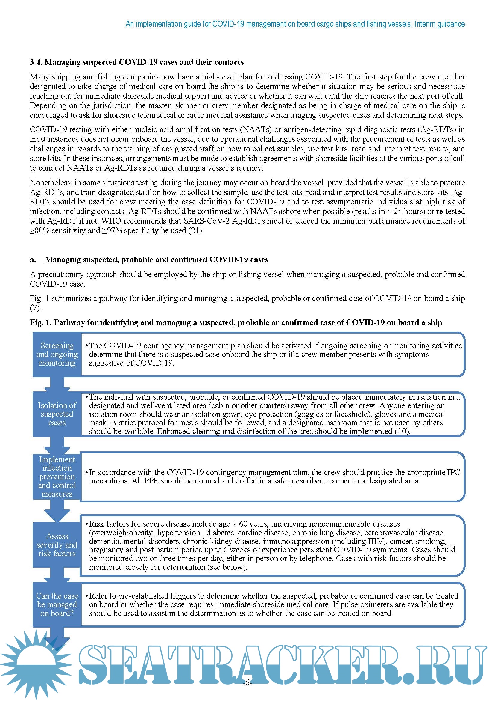 Year: 2021 Language: english Author: WHO Genre: Guide Format: PDF Quality: eBook Pages count: 14 Description: Ship personnel, whether working on ships engaged in cargo transport or fishing, typically work in close contact environments and are therefore susceptible to the transmission of SARS-CoV-2. A COVID-19 outbreak presents special risks for crew and officers making extended voyages without calling at any port and lacking access to shoreside medical facilities. Such an outbreak puts their safety and well-being at risk and may affect their ability to safely navigate and operate the ship (1). In this document, the term “ship personnel” refers to individuals who work on one of two types of vessels: • a cargo ship that is not a passenger ship • a fishing vessel that is any ship or boat, of any nature whatsoever, irrespective of the form of ownership, used or intendedto be used for the purpose of commercial fishing (2) of fish, whales, seals, walrus or other living resources of the sea,defined in the International Convention for the Safety of Life at Sea (3).