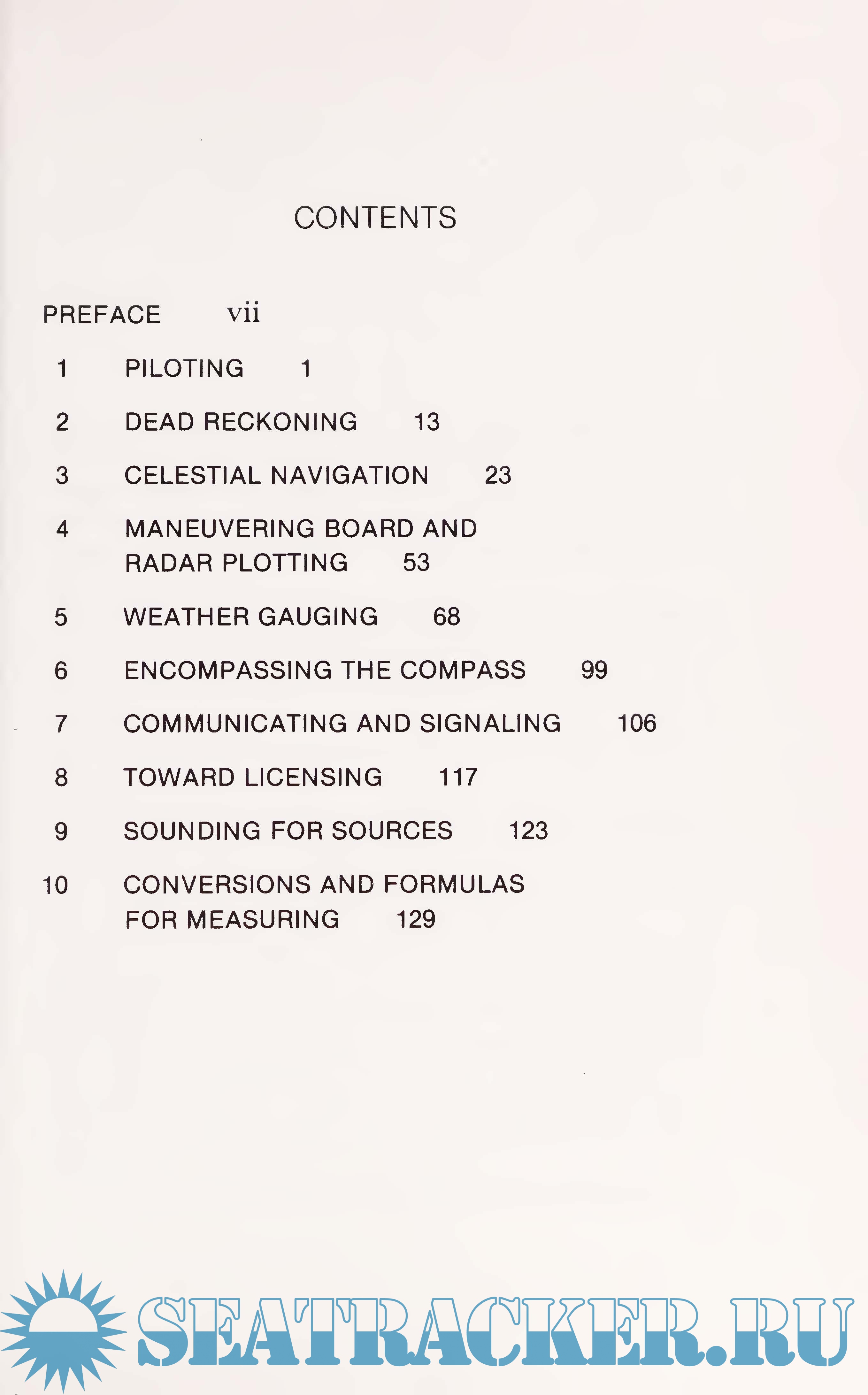 Material selected for inclusion in this volume is usable on all vessels. Smaller, slower vessels, however, are more subject to winds and currents than larger vessels —in the length of exposure and in the relative effect that seas and currents have on their mo¬ tion, steering, and speed. Added vigilance is often essential on smaller vessels, and for this reason, relevant sections in this book have been made more extensive. The purpose of this book is to provide a handy reference for crews already at sea. Accordingly, the presentation assumes some familiarity with seagoing subjects.
