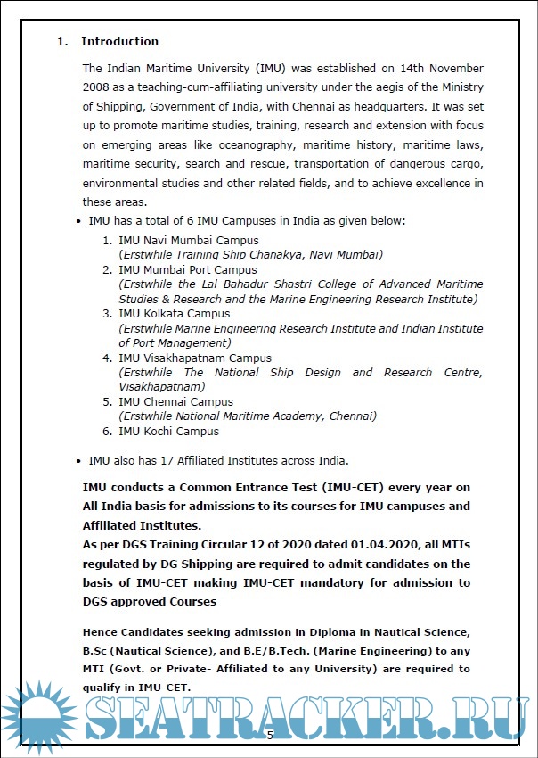 Year: 2022-2023 Language: english Author: Indian Maritime University (IMU) Publisher: Indian Maritime University Format: PDF Quality: eBook Pages count: 63 Description: The Indian Maritime University (IMU) was established on 14th November 2008 as a teaching-cum-affiliating university under the aegis of the Ministry of Shipping, Government of India, with Chennai as headquarters. It was set up to promote maritime studies, training, research and extension with focus on emerging areas like oceanography, maritime history, maritime laws, maritime security, search and rescue, transportation of dangerous cargo, environmental studies and other related fields, and to achieve excellence in these areas. IMU is the apex institution in the field of Maritime Education in India. The university’s significance can be viewed from the axial role it is playing by imparting best Maritime Education and tapping best talents for the Maritime sector. IMU conducts a Common Entrance Test (IMU-CET) every year on All India basis for admissions to its courses for IMU campuses and Affiliated Institutes. Additional info: A Central University Under the Ministry of Ports, Shipping & Waterways, Government of India.