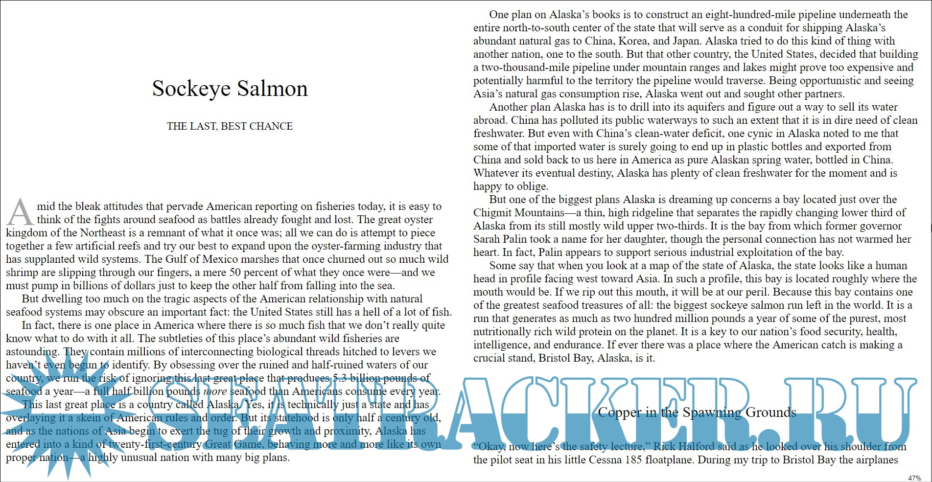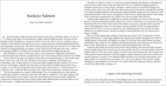 Finally, Greenberg visits Bristol Bay, Alaska, home to the biggest wild sockeye salmon run left in the world. A pristine, productive fishery, Bristol Bay is now at great risk: The proposed Pebble Mine project could under¬mine the very spawning grounds that make this great run possible. In his search to discover why this pre¬cious renewable resource isn’t better protected, Green¬berg encounters a shocking truth: the great majority of Alaskan salmon is sent out of the country, much of it to Asia. Sockeye salmon is one of the most nutritionally dense animal proteins on the planet, yet Americans are shipping it abroad.