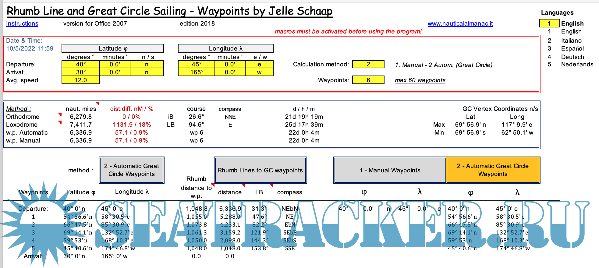 Description: This software allows students, Cadets, Officers and Captains of the "merchant navy " : courses, distances (rhumb line & great circle sailing), orthodromic data ( vertex coordinates ), ETA, compass direction, manual-automatic waypoints calculator and planning routes, to maneuver the ship in any condition, how to calculate altitude and azimuth and much more.