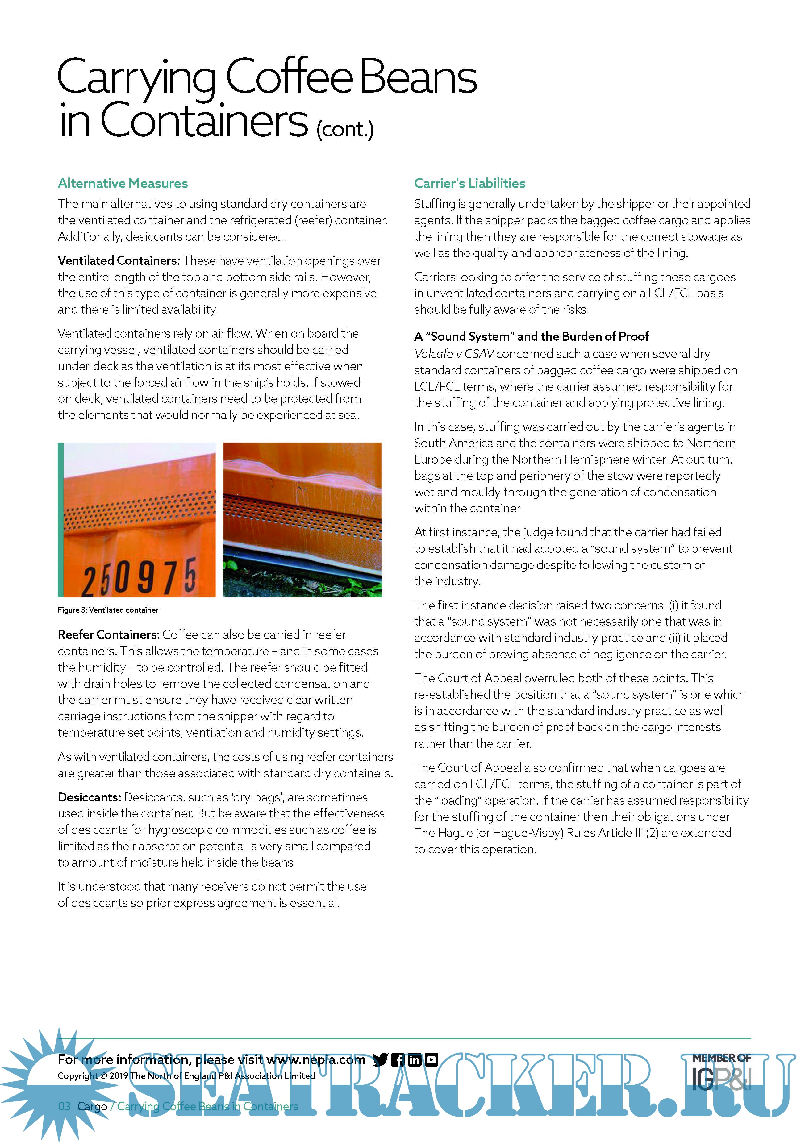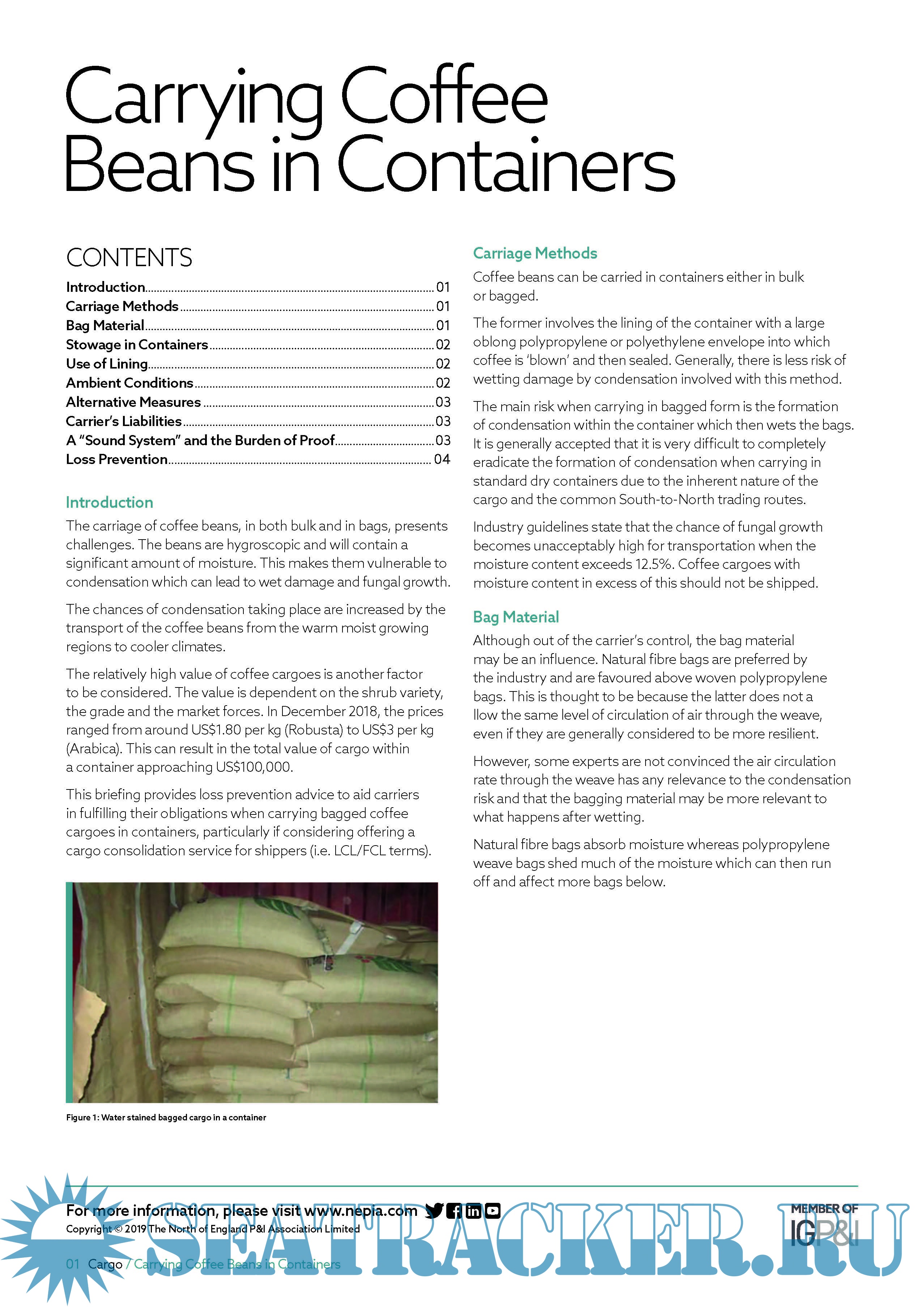 This briefing provides loss prevention advice to aid carriers in fulfilling their obligations when carrying bagged coffee cargoes in containers, particularly if considering offering a cargo consolidation service for shippers.
