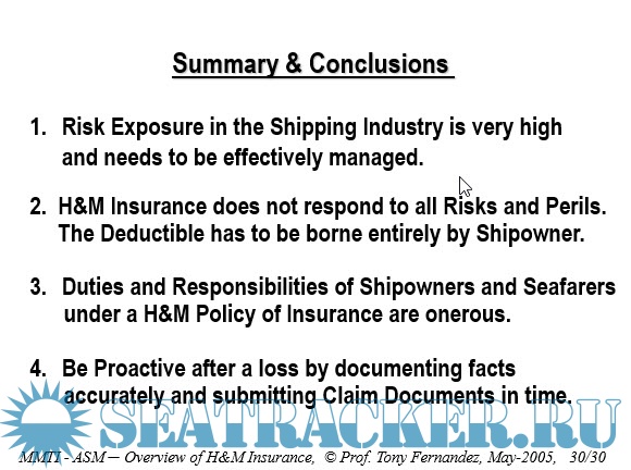 Year: 2005 Language: english Author: Tony Fernandez Publisher: Mumbai Maritime Training Institute, India Format: PPT Quality: eBook Pages count: 30 Description: Presentation Objectives: 1. To enumerate the nature and extent of Risk Exposure to a Shipowner and to Seafarers. 2. To discuss Principles of insurance and the nature and extent of H&M and P&I Cover for Shipowners. 3. To describe the responsibilities of Shipowners and Seafarers under a H&M Policy of Insurance. 4. To appreciate the process of Claims Settlements and be proactive in case of an accident.