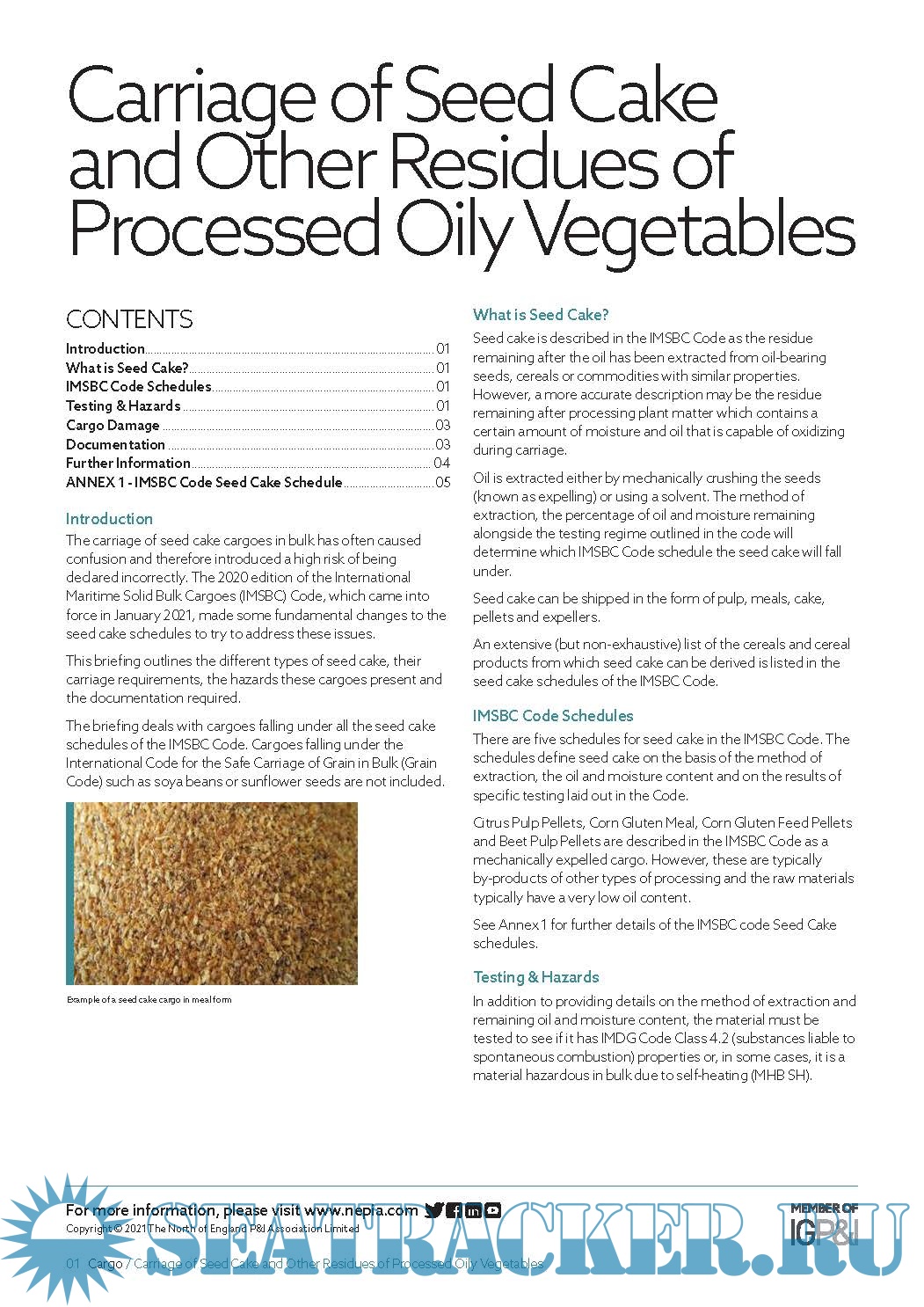 Year: 202x Language: english Author: the North Genre: Practical guide Format: PDF Quality: eBook Pages count: 6 Description: The carriage of seed cake cargoes in bulk has often caused confusion and therefore introduced a high risk of being declared incorrectly. The 2020 edition of the International Maritime Solid Bulk Cargoes (IMSBC) Code, which came into force in January 2021, made some fundamental changes to the seed cake schedules to try to address these issues. This paper outlines the different types of seed cake, their carriage requirements, the hazards these cargoes present and the documentation required. The briefing deals with cargoes falling under all the seed cake schedules of the IMSBC Code. Cargoes falling under the International Code for the Safe Carriage of Grain in Bulk (Grain Code) such as soya beans or sunflower seeds are not included.