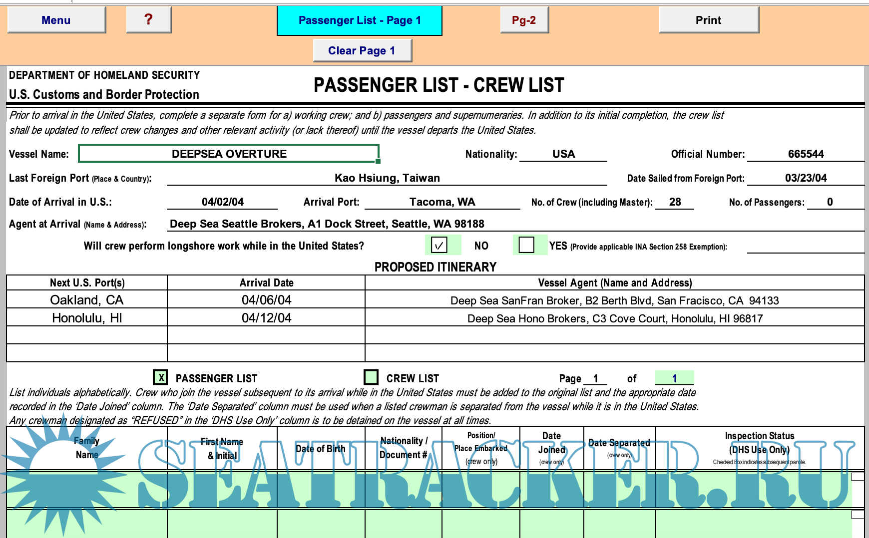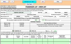 This program is a customized Excel workbook that generates a crew list form identical to the two page (1/2003) I-418 U.S. Crew List.