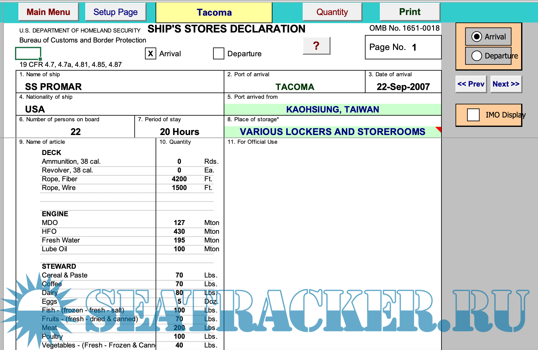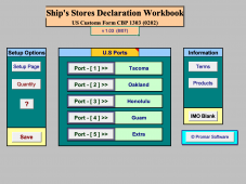 The CBP1303 workbook utilizes a series of macro menus to provide an easy to use template for completing the US Customs Form 1303 (rev 02/02) Ship's Stores Declartion form by Arriving/Departing vessels within the US. This workbook includes template forms for five (5) US ports. For vessels calling on multiple US ports these template forms can be easily customized for each port.