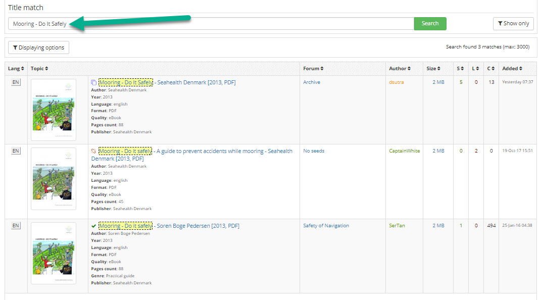 1) Do a manual search for the title (Less words & key words...avoid punctuations and hyphens etc.) e.g. Mooring alone would be sufficient. You can add more words to filter the search.