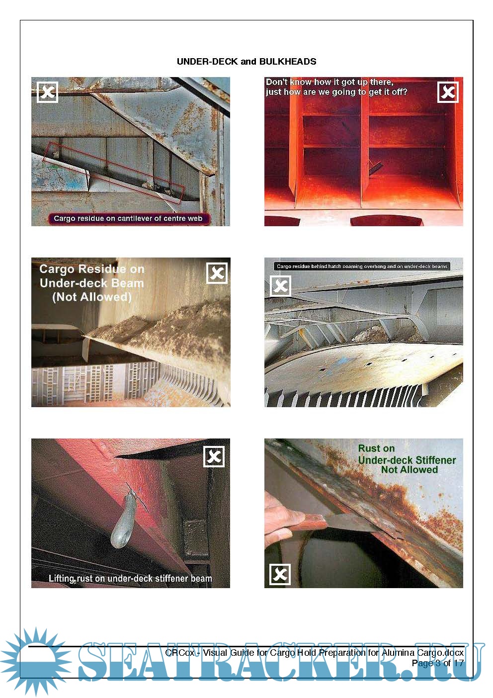Year: 201x Language: english Author: C.R. COX Genre: Guide Format: PDF Quality: eBook Pages count: 17 Description: Following is a visual guideline/Visual Guide Cargo Hold Preparation for Alumina, compiled by experienced surveyors at C.R.COX & ASSOCIATES, as to what is accepted and what is not. It covers many issues that might exist in cargo holds, but is by no means a complete list.