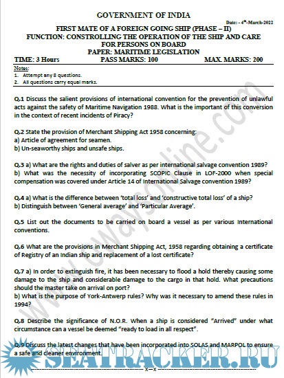Question Paper Set for Maritime Legislation (July 2022) Phase II (Chief Mate F.G.) Mercantile Marine Department (MMD), India Examinations