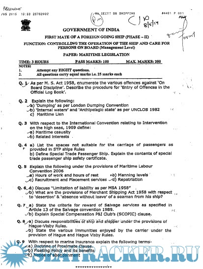 Question Paper Set for Maritime Legislation (November) Phase II (Chief Mate F.G.) Mercantile Marine…
