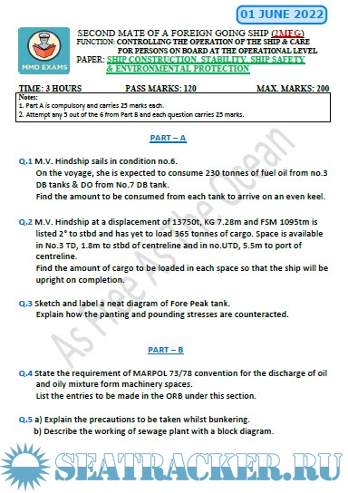 Question Paper Set for Ship Construction, Stability Ship Safety and Environment Protection (July 2022) for Second Mate (F.G.) Mercantile Marine Department (MMD), India Examinations