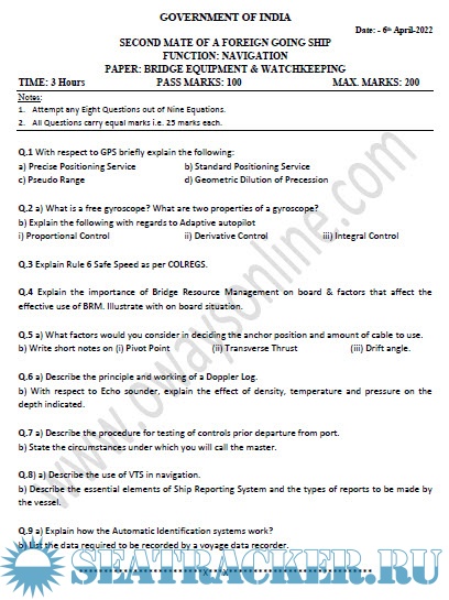 Question Paper Set (2022-2016) for Second Mate (F.G.) Mercantile Marine Department (MMD), India…
