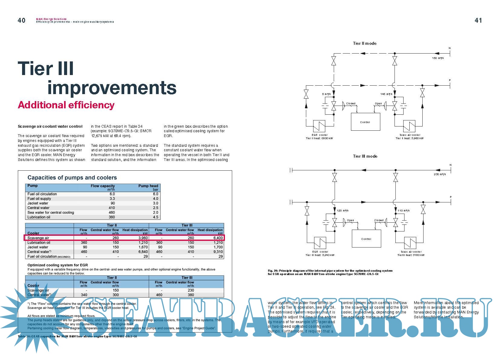 Year: 2018 Language: english Author: MAN B&w Genre: Other Format: PDF Quality: eBook Pages count: 44 Description: In the design process of main engine auxiliary systems conducted by the shipyard, options that could improve efficiency and reduce daily fuel oil consumption and consequently CO2 emission are available. The options cover power efficiency improvements of electric auxiliary equipment, for example pumps, fans, etc., serving the main engine, but also efficiency improvements related directly to the main engine specific fuel oil consumption. This technical paper describes each of the different relevant main engine auxiliary systems and the options available for efficiency improvements. Different solutions are mentioned for each system, some of these can be combined and the savings potential added up, while others will exclude each other depending on the selected option.
