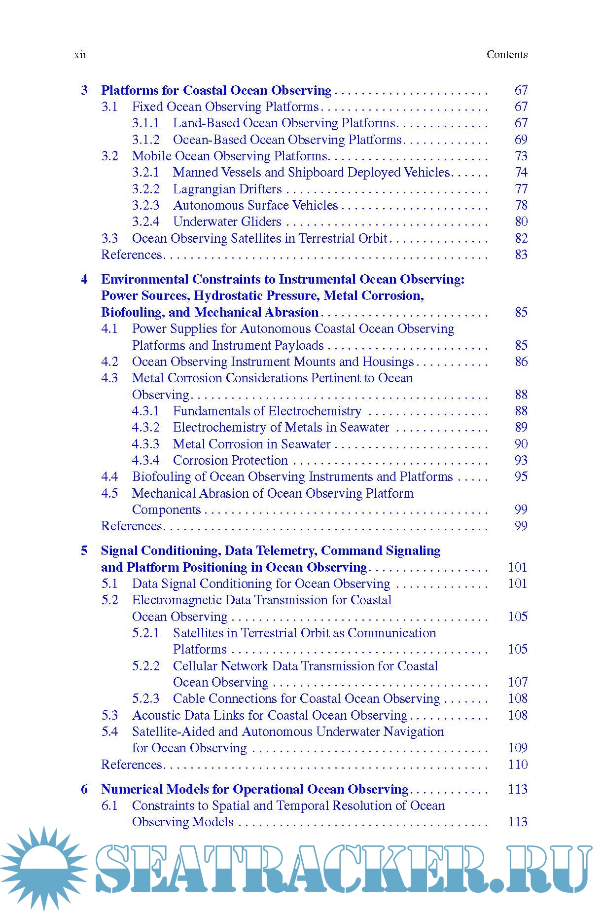 Description: This manual describes the wide range of electromechanical, electrochemical and electro-optical transducers at the heart of current field-deployable ocean observing instruments. Their modes of operation, precision and accuracy are discussed in detail. Observing platforms ranging from the traditional to the most recently developed are described, as are the challenges of integrating instrument suits to individual platforms. Technical approaches are discussed to address environmental constraints on instrument and platform operation such as power sources, corrosion, biofouling and mechanical abrasion. Particular attention is also given to data generated by the networks of observing platforms that are typically integrated into value-added data visualization products, including numerical simulations or models. Readers will learn about acceptable data formats and representative model products. The last section of the book is devoted to the challenges of planning, deploying and maintaining coastal ocean observing systems.